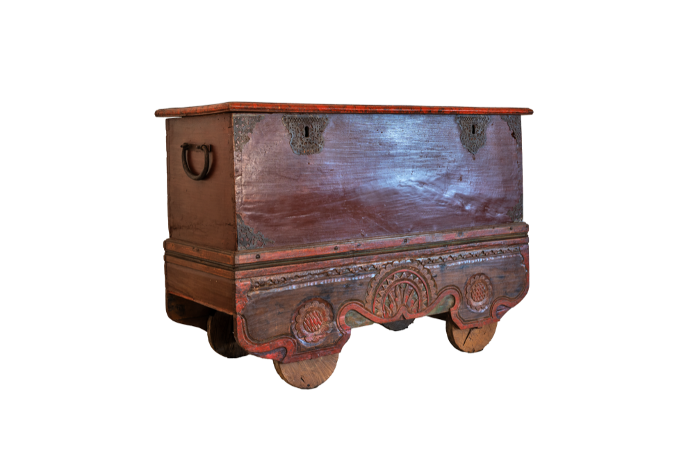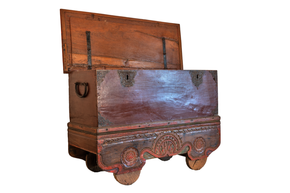 Baule nuziale balinese in legno di teak con ruote, intagli floreali e inserti in ottone #1053ID2990