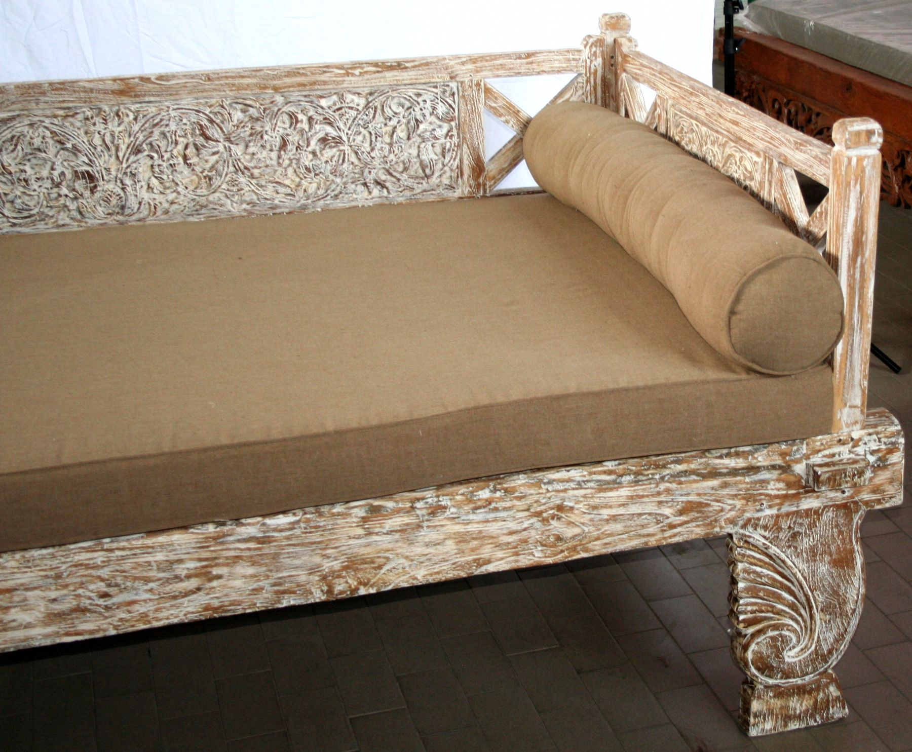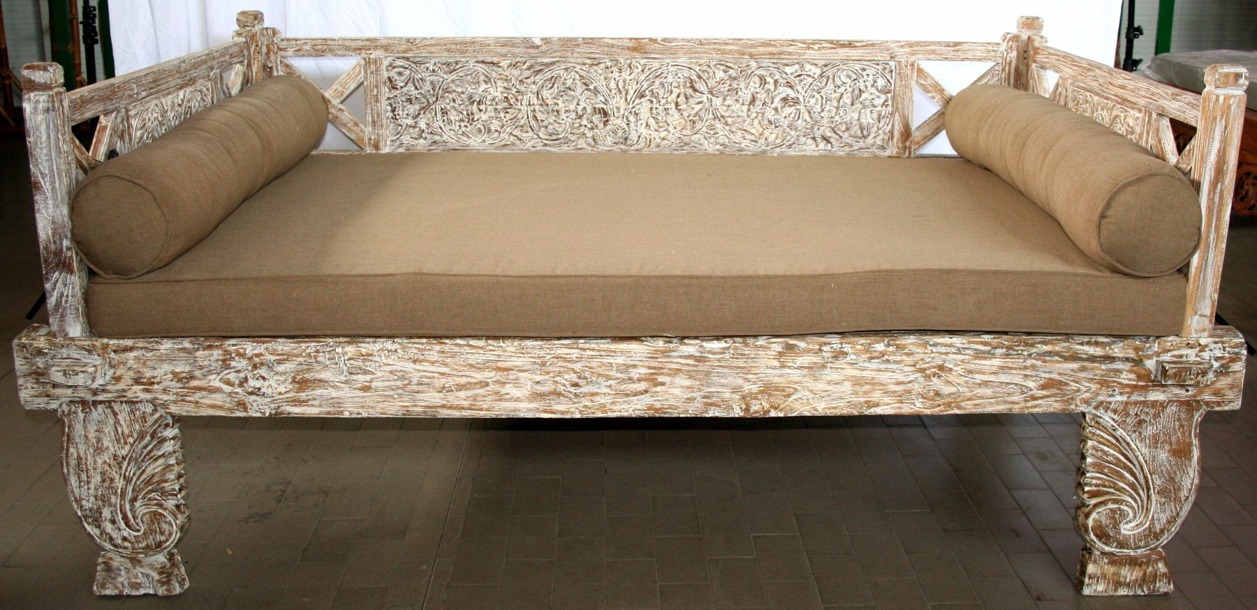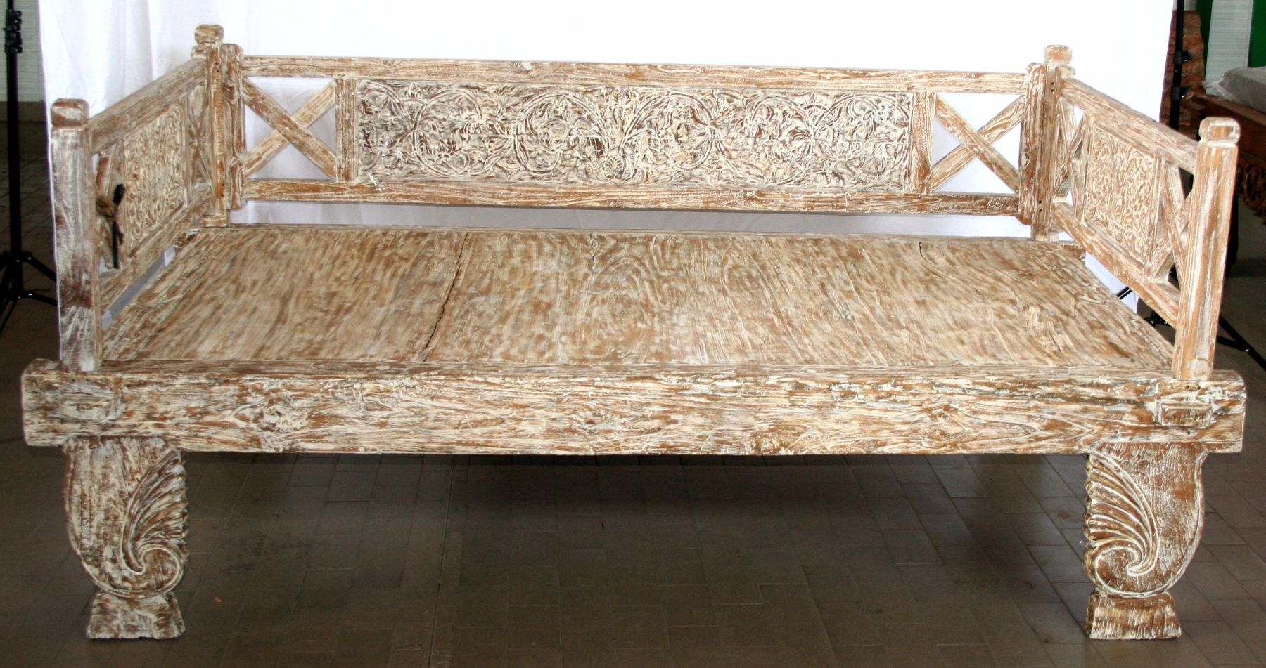 Daybed balinese in legno di teak con finitura bianco decapato ed intagli floreali #1360ID3790