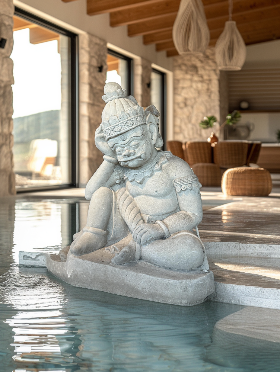 Siamo le statue dei guardiani, colti nel momento di meritato riposo. Siamo fatti di Limestone, una pietra calcarea plasmata da mastri scultori, che hanno saputo restituire la bellezza della nostra posa in tutti i dettagli.