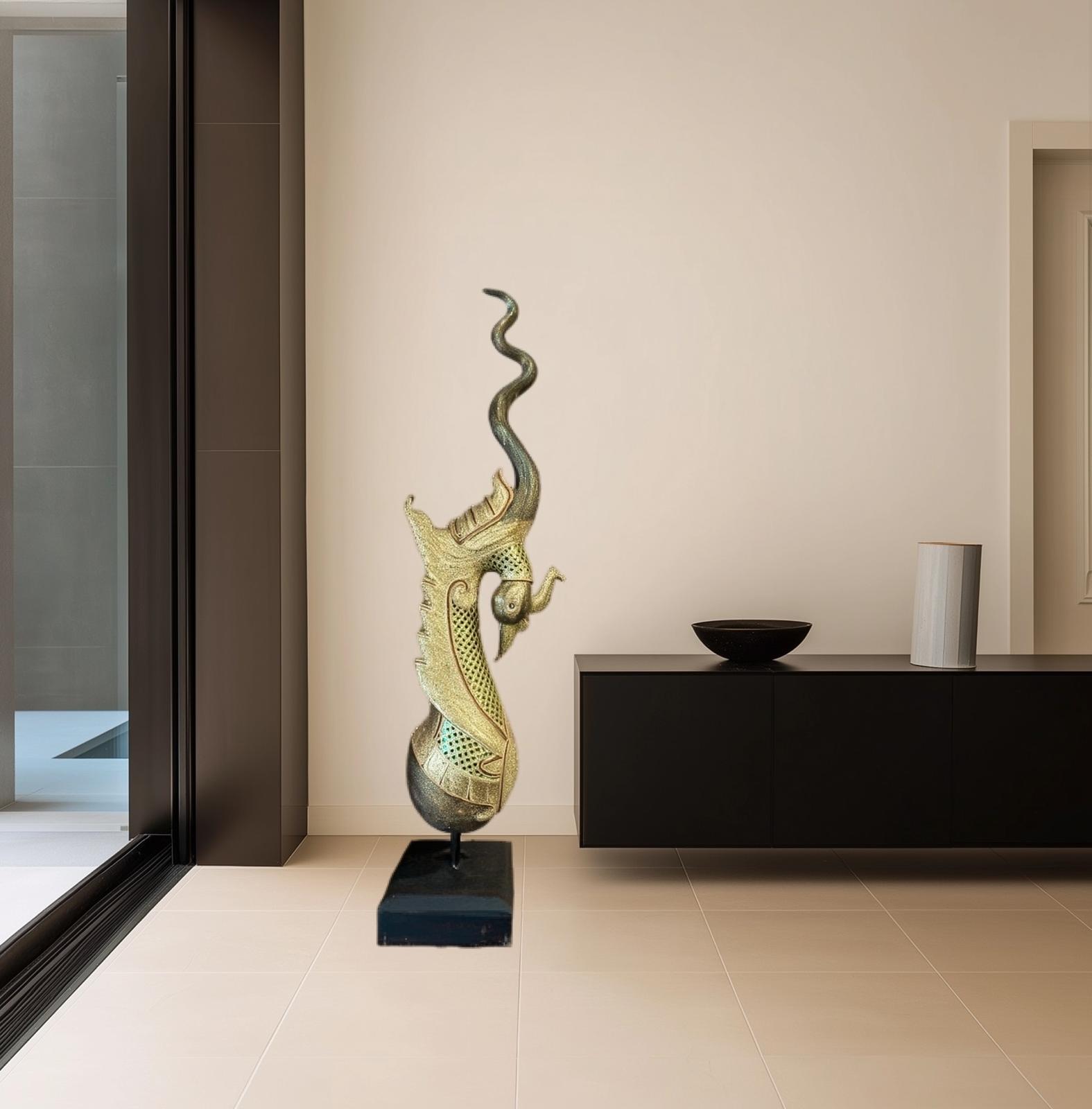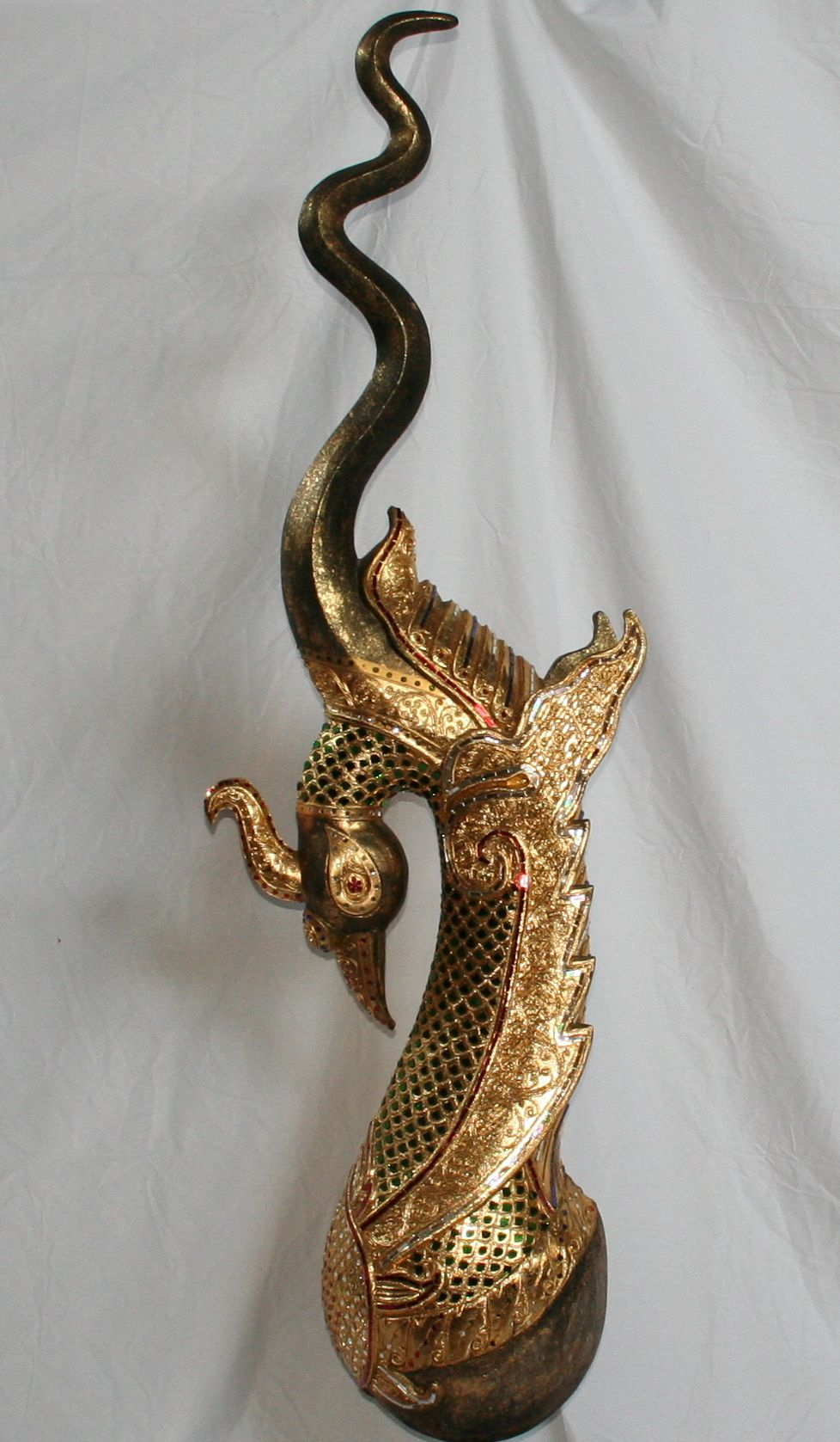 Chiamatemi Naga. Sono una scultura di inizi '900 in raffinato legno di teak, arricchito da vetri e specchi scintillanti per ricordare i primi esemplari che proteggevano e decoravano i templi buddisti realizzati in oro e pietre preziose. Dall’alto dei tetti dei templi tailandesi sono planato qui, per vegliare sulle vite degli uomini. Sono sontuoso, e maestoso, perché grande è il mio potere. Sono il dio serpente, venerato nel mio aspetto benevolo e temuto in quello demoniaco.