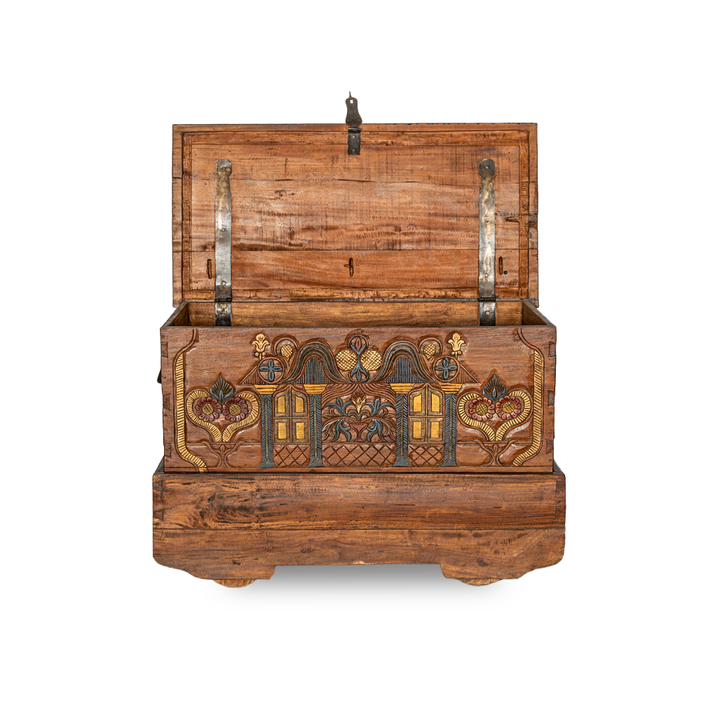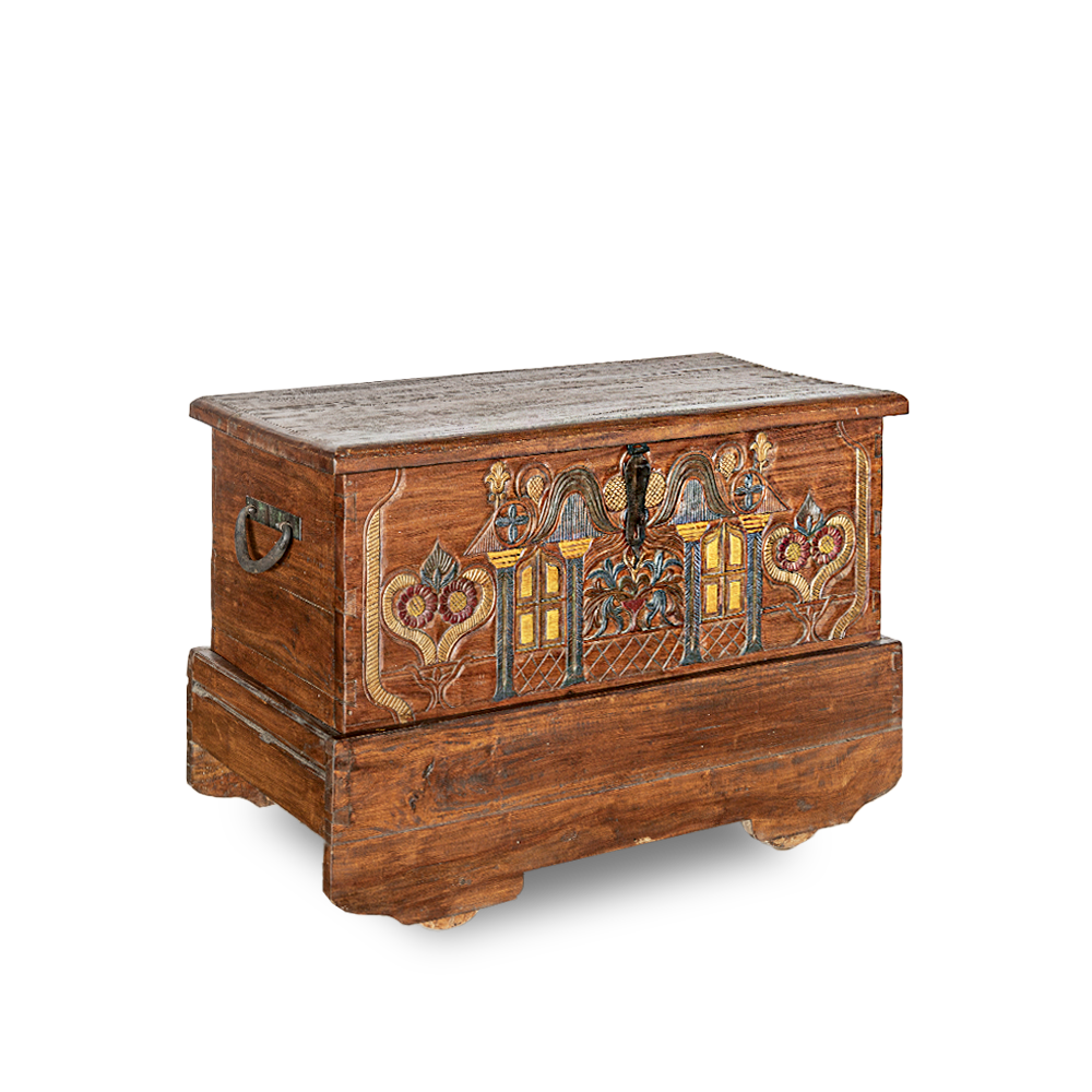 Baule antico indonesiano con ruote in legno di teak intagliato e dipinto a mano #1051ID1590 -16%