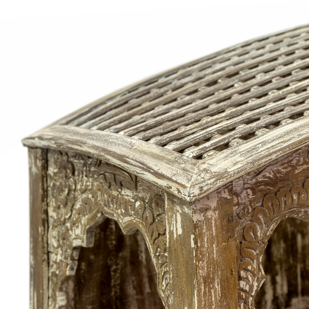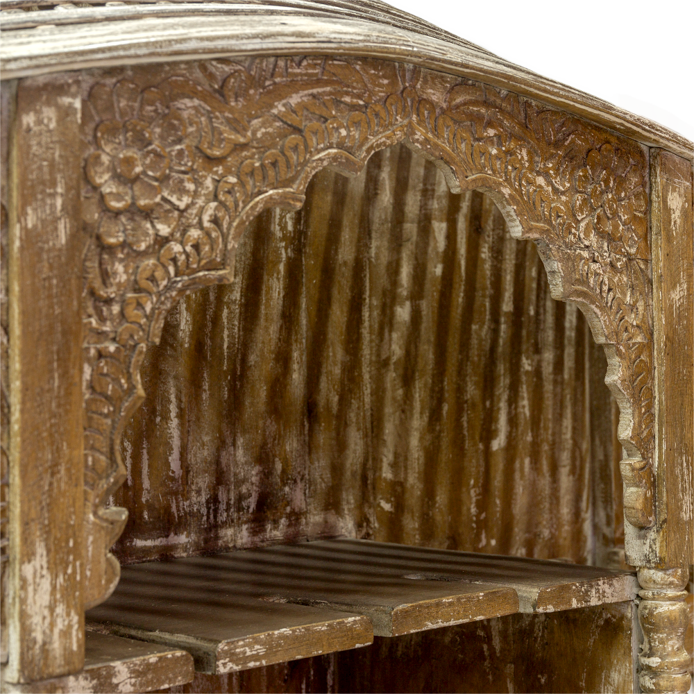 Provenienza: India del Nord, Rajasthan Dimensioni (massimo ingombro): lunghezza cm 78 x profondità cm 56 x altezza cm 196 Materiali: Legno massello di teak, proveniente da strutture architettoniche dismesse e restaurato con tecniche tradizionali. Finitura naturale a cera che ne esalta il tono caldo e le venature originali. Lavorazioni: Struttura interamente intagliata a mano, con decori floreali, motivi geometrici e cornici tipiche delle finestre e portali dei palazzi Rajput. Il legno recuperato viene pulito, trattato e assemblato manualmente, mantenendo la patina autentica e le tracce del tempo. Finitura con oli e cere naturali che proteggono il materiale senza alterarne la bellezza originaria. Struttura: Libreria con quattro ripiani interni racchiusi da un’imponente cornice scolpita a rilievo. La cornice superiore, con fregi traforati, richiama le tipiche aperture architettoniche indiane (jharokha), rendendo il pezzo non solo funzionale ma anche altamente decorativo. La base solida e il frontale riccamente lavorato conferiscono equilibrio tra robustezza e raffinatezza estetica. Autenticità: Ogni esemplare è un pezzo unico, poiché realizzato con cornici originali del XIX-XX secolo provenienti da residenze nobiliari del Rajasthan. Le imperfezioni, le differenze di tono e i segni d’uso sono parte integrante della sua storia e ne certificano la provenienza e la lavorazione artigianale. Perché sceglierla? Un pezzo di storia: racchiude frammenti autentici dell’architettura tradizionale indiana. Lavorazione artigianale: ogni dettaglio scolpito è il risultato di ore di lavoro manuale e maestria tramandata. Eleganza etnica e senza tempo: perfetta per ambienti contemporanei, rustici o eclettici. Sostenibilità e recupero: realizzata con legno antico riutilizzato, in armonia con l’ambiente e la memoria del passato. Io, raffinata libreria, sarò come finestra sui vostri oggetti personali. Proprio così come sono stata finestra sulla meravigliosa città dorata di Jaisalmer. La mia facciata infatti, è composta da diverse parti recuperate da lussureggianti palazzi di maharaja, al nord dell'antica India. Osservate i miei intagli, resi nel dettaglio da mani artigiane nel mio pregiato legno di teak: simbologie geometriche, foglie, fiori e forme sinuose. Ogni centimetro della mia superficie è curato in ogni particolare e ogni movimento. Inseritemi nei vostri spazi e riempite i miei eleganti ripiani con i vostri oggetti, saranno incorniciati nella danza dei miei dettagli, raffinati e selvaggi come la Natura che rappresentano. Importato da Colori dal Mondo s.r.l.
