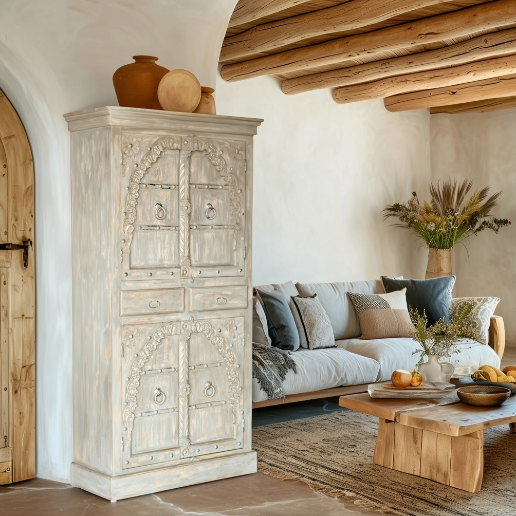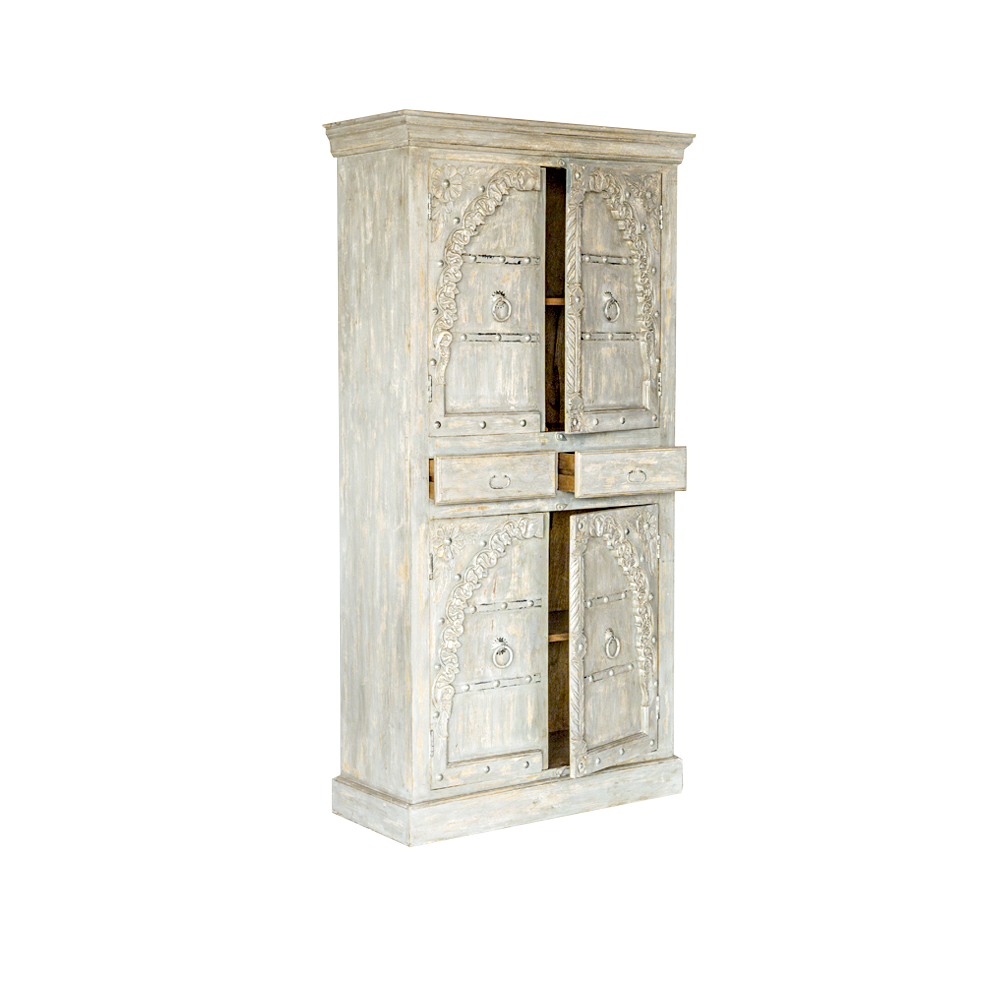 Provenienza: India del Nord, Rajasthan Dimensioni (massimo ingombro): lunghezza cm 90 x profondità cm 52 x altezza cm 180 Materiali: legno massello di mango con ante realizzate in legno di teak recuperato da antichi portali, fregi architettonici e timbri in legno utilizzati per la stampa dei tessuti Lavorazione: intaglio e assemblaggio artigianale, finitura naturale con mantenimento della patina originale Struttura: due ampie ante frontali con chiusura a battente, interno spazioso con ripiani in legno massello Autenticità: non esiste un altro armadio uguale: ogni intaglio, ogni timbro e ogni frammento antico ne fanno un’opera irripetibile di artigianato indiano Perchè sceglierlo: È un capolavoro di artigianato, nato dal recupero di elementi antichi carichi di significato Ogni dettaglio inciso racconta simboli di protezione, prosperità e buon auspicio Dona calore, forza e fascino alla casa grazie alle sfumature naturali del legno di mango Trasforma ogni ambiente in uno spazio d’anima, dove storia e design si incontrano Sono un armadio nato a Jaipur, in India e porto con me la memoria di un tempo lontano. Le mie ante raccontano un mosaico di legni antichi, provenienti da fregi, portali e antichi timbri che un tempo venivano usati per la stampa dei tessuti nelle botteghe artigiane del Rajasthan. Ogni frammento è unico, inciso a mano, e custodisce simboli di protezione e armonia tramandati dalla tradizione indiana. Nel tuo spazio saprò unire la raffinatezza dell’Oriente alla funzionalità contemporanea, aggiungendo calore, carattere e un tocco di mistero che catturerà ogni sguardo. Importato da Colori dal Mondo s.r.l.