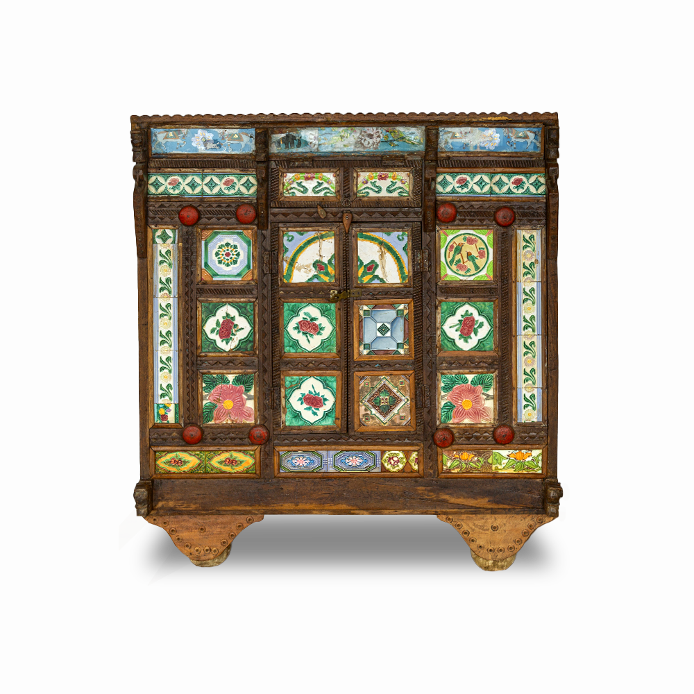Credenza Damchiya (Baule Nuziale)indiano antico in legno di teak intagliato e inserti di piastrelle dipinte a mano, veniva usato per riporre la dote della sposa  #1146IN2190 -20%