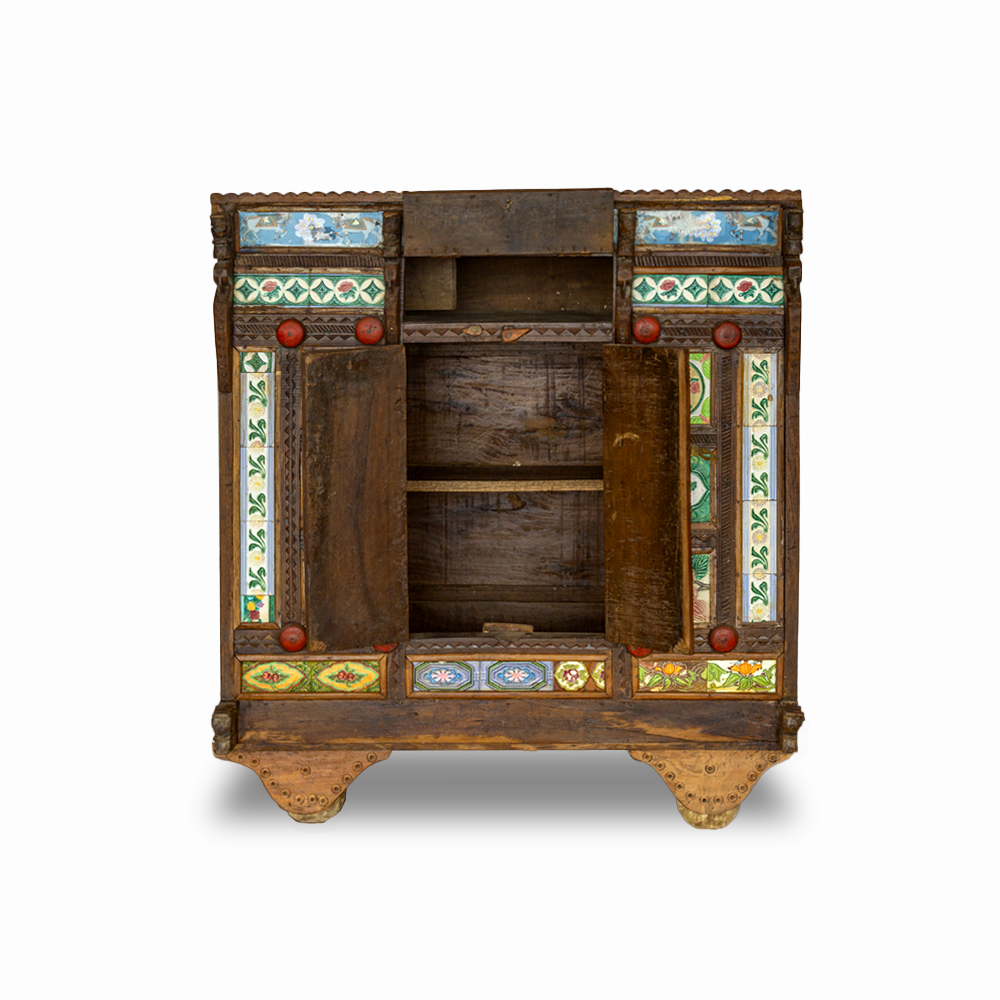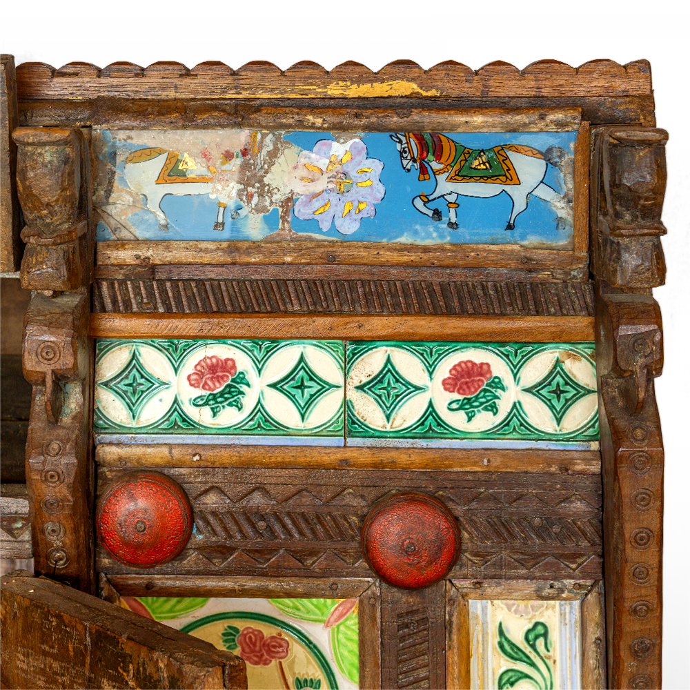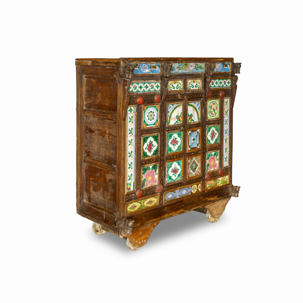 Credenza Damchiya (Baule Nuziale)indiano antico in legno di teak intagliato e inserti di piastrelle dipinte a mano, veniva usato per riporre la dote della sposa #1146IN2190