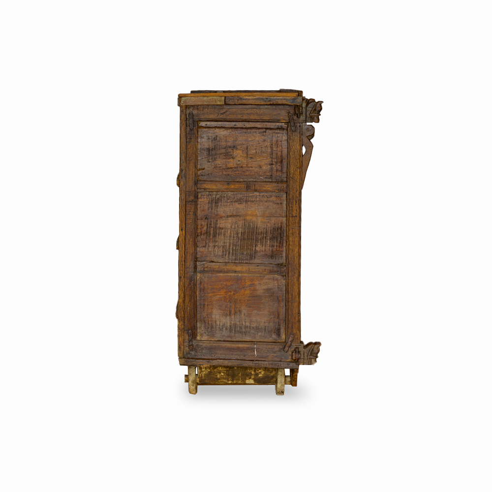 Provenienza: India del Nord, Rajasthan Dimensioni (massimo ingombro): lunghezza cm 90 x profondità cm 52 x altezza cm 180 Materiali: legno massello di mango con ante realizzate in legno di teak recuperato da antichi portali, fregi architettonici e timbri in legno utilizzati per la stampa dei tessuti Lavorazione: intaglio e assemblaggio artigianale, finitura naturale con mantenimento della patina originale Struttura: due ampie ante frontali con chiusura a battente, interno spazioso con ripiani in legno massello Autenticità: non esiste un altro armadio uguale: ogni intaglio, ogni timbro e ogni frammento antico ne fanno un’opera irripetibile di artigianato indiano Perchè sceglierlo: È un capolavoro di artigianato, nato dal recupero di elementi antichi carichi di significato Ogni dettaglio inciso racconta simboli di protezione, prosperità e buon auspicio Dona calore, forza e fascino alla casa grazie alle sfumature naturali del legno di mango Trasforma ogni ambiente in uno spazio d’anima, dove storia e design si incontrano Sono un armadio nato a Jaipur, in India e porto con me la memoria di un tempo lontano. Le mie ante raccontano un mosaico di legni antichi, provenienti da fregi, portali e antichi timbri che un tempo venivano usati per la stampa dei tessuti nelle botteghe artigiane del Rajasthan. Ogni frammento è unico, inciso a mano, e custodisce simboli di protezione e armonia tramandati dalla tradizione indiana. Nel tuo spazio saprò unire la raffinatezza dell’Oriente alla funzionalità contemporanea, aggiungendo calore, carattere e un tocco di mistero che catturerà ogni sguardo. Importato da Colori dal Mondo s.r.l.