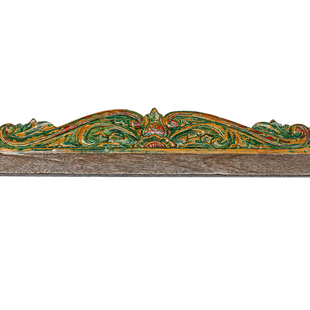 Provenienza: India del Nord, Rajasthan Dimensioni (massimo ingombro): lunghezza cm 78 x profondità cm 56 x altezza cm 196 Materiali: Legno massello di teak, proveniente da strutture architettoniche dismesse e restaurato con tecniche tradizionali. Finitura naturale a cera che ne esalta il tono caldo e le venature originali. Lavorazioni: Struttura interamente intagliata a mano, con decori floreali, motivi geometrici e cornici tipiche delle finestre e portali dei palazzi Rajput. Il legno recuperato viene pulito, trattato e assemblato manualmente, mantenendo la patina autentica e le tracce del tempo. Finitura con oli e cere naturali che proteggono il materiale senza alterarne la bellezza originaria. Struttura: Libreria con quattro ripiani interni racchiusi da un’imponente cornice scolpita a rilievo. La cornice superiore, con fregi traforati, richiama le tipiche aperture architettoniche indiane (jharokha), rendendo il pezzo non solo funzionale ma anche altamente decorativo. La base solida e il frontale riccamente lavorato conferiscono equilibrio tra robustezza e raffinatezza estetica. Autenticità: Ogni esemplare è un pezzo unico, poiché realizzato con cornici originali del XIX-XX secolo provenienti da residenze nobiliari del Rajasthan. Le imperfezioni, le differenze di tono e i segni d’uso sono parte integrante della sua storia e ne certificano la provenienza e la lavorazione artigianale. Perché sceglierla? Un pezzo di storia: racchiude frammenti autentici dell’architettura tradizionale indiana. Lavorazione artigianale: ogni dettaglio scolpito è il risultato di ore di lavoro manuale e maestria tramandata. Eleganza etnica e senza tempo: perfetta per ambienti contemporanei, rustici o eclettici. Sostenibilità e recupero: realizzata con legno antico riutilizzato, in armonia con l’ambiente e la memoria del passato. Io, raffinata libreria, sarò come finestra sui vostri oggetti personali. Proprio così come sono stata finestra sulla meravigliosa città dorata di Jaisalmer. La mia facciata infatti, è composta da diverse parti recuperate da lussureggianti palazzi di maharaja, al nord dell'antica India. Osservate i miei intagli, resi nel dettaglio da mani artigiane nel mio pregiato legno di teak: simbologie geometriche, foglie, fiori e forme sinuose. Ogni centimetro della mia superficie è curato in ogni particolare e ogni movimento. Inseritemi nei vostri spazi e riempite i miei eleganti ripiani con i vostri oggetti, saranno incorniciati nella danza dei miei dettagli, raffinati e selvaggi come la Natura che rappresentano. Importato da Colori dal Mondo s.r.l.