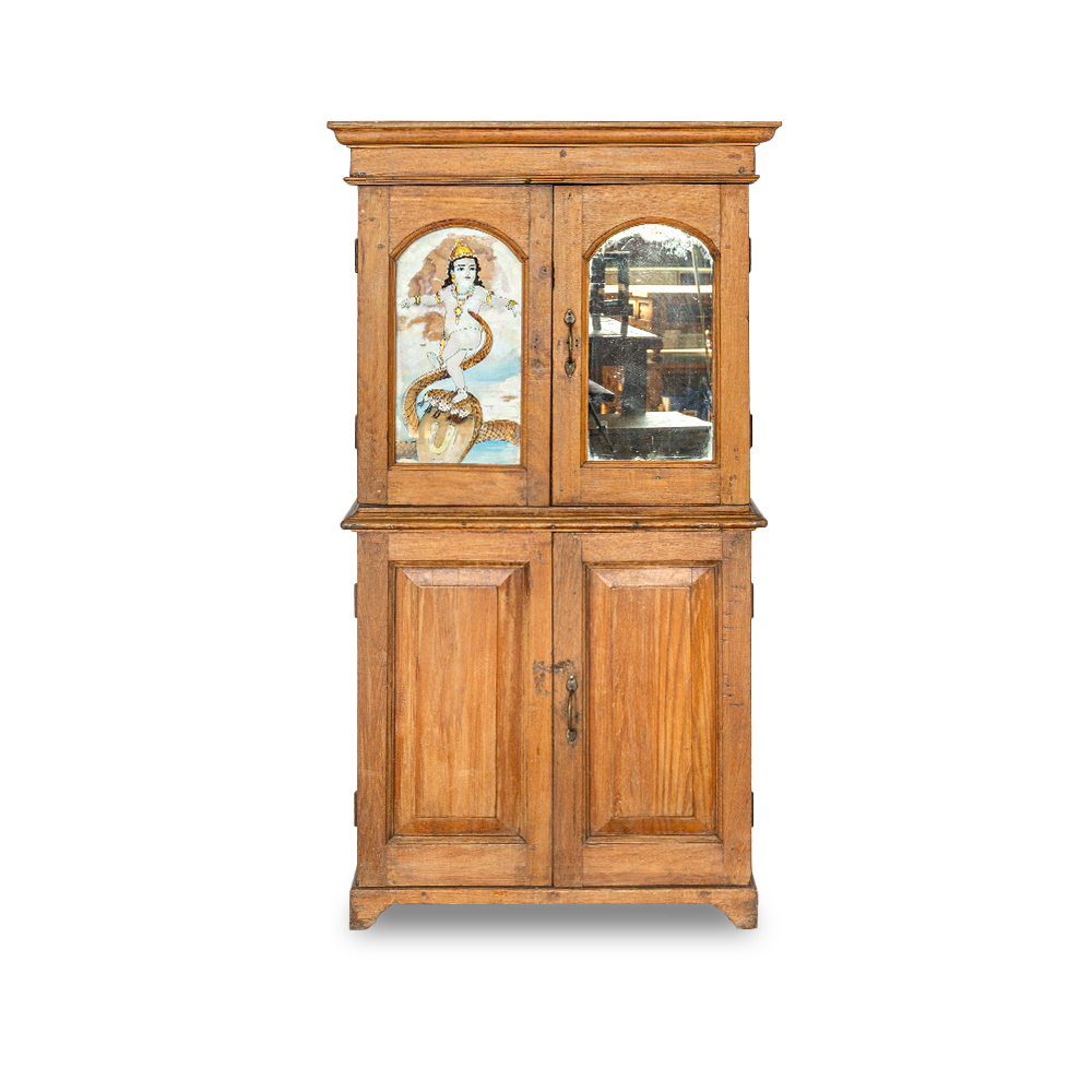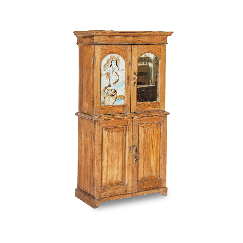 Credenza indiana antica in teak con vetro dipinto con raffigurazione del Dio Shiva #1021IN1590