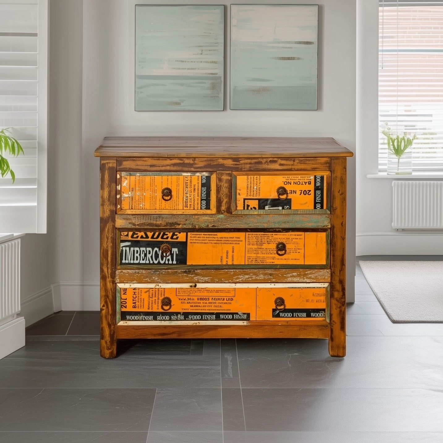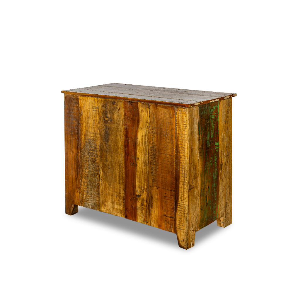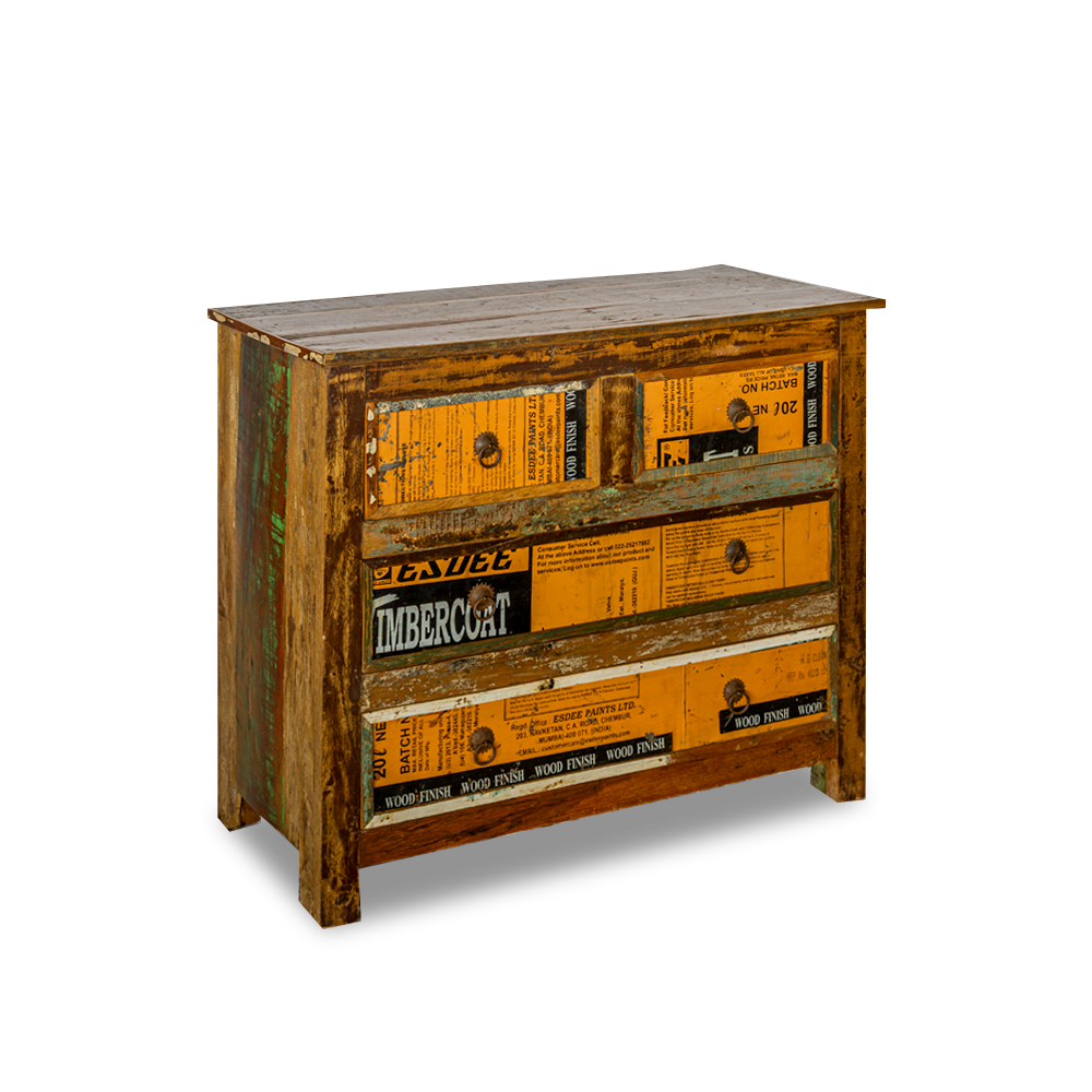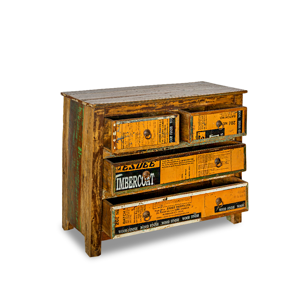 Cassettiera indiana in legno di teak recuperato modello industriale con 4 cassetti ricoperti in latta recuperata da antichi contenitori di cera #1071IN690