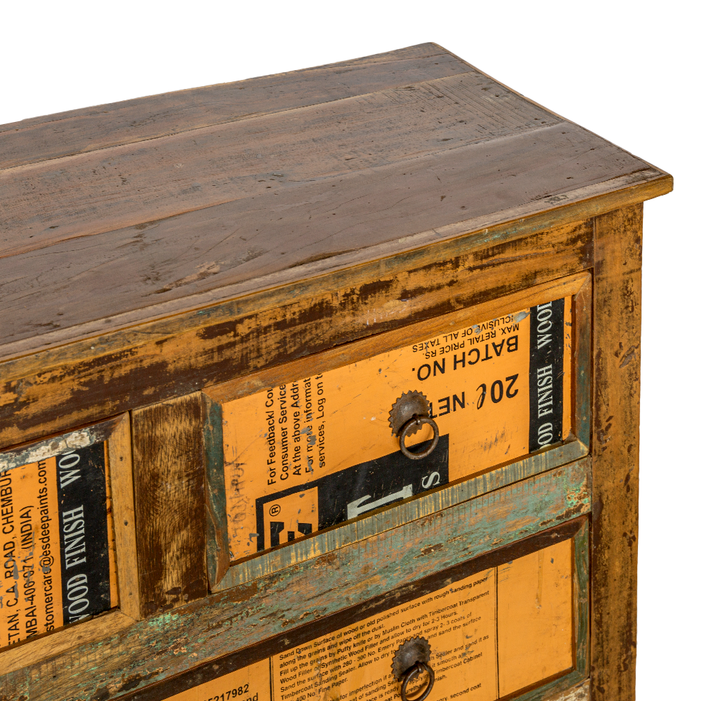 Cassettiera indiana in legno di teak recuperato modello industriale con 4 cassetti ricoperti in latta recuperata da antichi contenitori di cera  #1071IN690 -19%