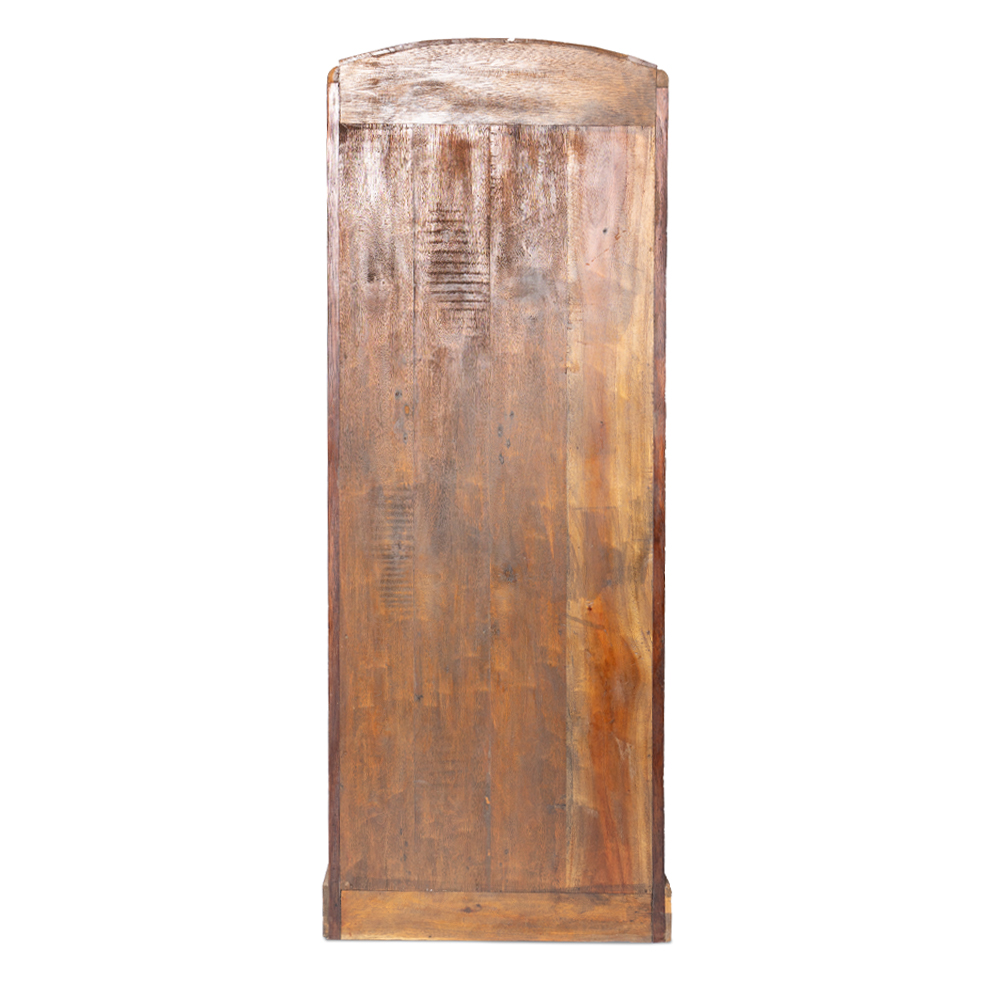 Provenienza: India del Nord, Rajasthan Dimensioni (massimo ingombro): lunghezza cm 90 x profondità cm 52 x altezza cm 180 Materiali: legno massello di mango con ante realizzate in legno di teak recuperato da antichi portali, fregi architettonici e timbri in legno utilizzati per la stampa dei tessuti Lavorazione: intaglio e assemblaggio artigianale, finitura naturale con mantenimento della patina originale Struttura: due ampie ante frontali con chiusura a battente, interno spazioso con ripiani in legno massello Autenticità: non esiste un altro armadio uguale: ogni intaglio, ogni timbro e ogni frammento antico ne fanno un’opera irripetibile di artigianato indiano Perchè sceglierlo: È un capolavoro di artigianato, nato dal recupero di elementi antichi carichi di significato Ogni dettaglio inciso racconta simboli di protezione, prosperità e buon auspicio Dona calore, forza e fascino alla casa grazie alle sfumature naturali del legno di mango Trasforma ogni ambiente in uno spazio d’anima, dove storia e design si incontrano Sono un armadio nato a Jaipur, in India e porto con me la memoria di un tempo lontano. Le mie ante raccontano un mosaico di legni antichi, provenienti da fregi, portali e antichi timbri che un tempo venivano usati per la stampa dei tessuti nelle botteghe artigiane del Rajasthan. Ogni frammento è unico, inciso a mano, e custodisce simboli di protezione e armonia tramandati dalla tradizione indiana. Nel tuo spazio saprò unire la raffinatezza dell’Oriente alla funzionalità contemporanea, aggiungendo calore, carattere e un tocco di mistero che catturerà ogni sguardo. Importato da Colori dal Mondo s.r.l.
