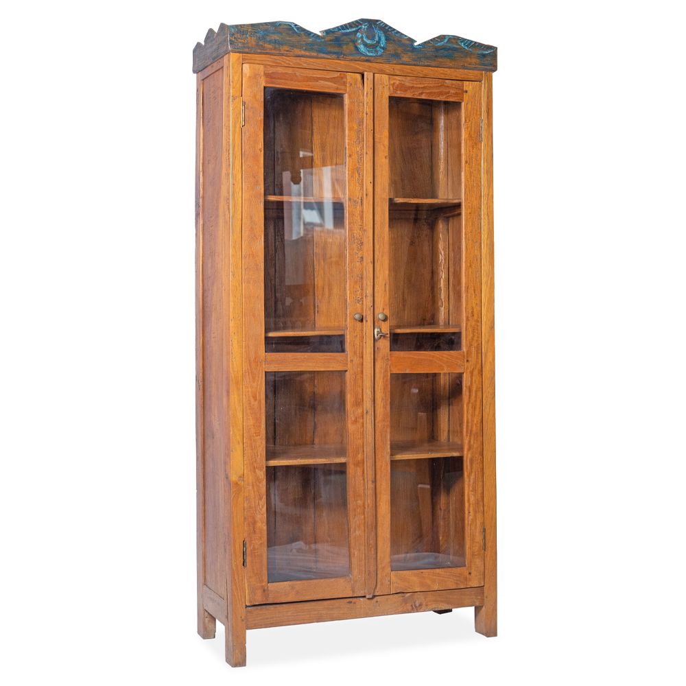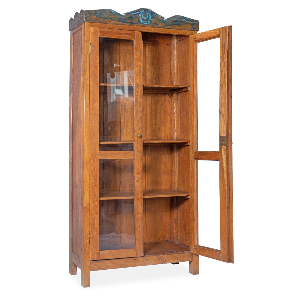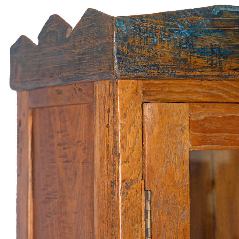 Vetrinetta in legno di teak balinese con bordo superiore intagliato e color blu #1230ID1490