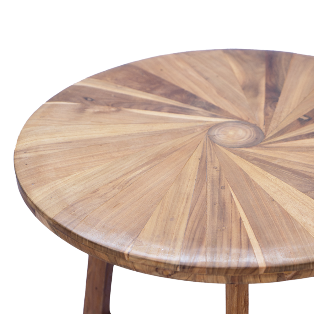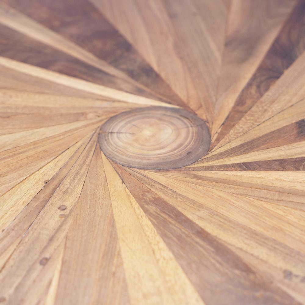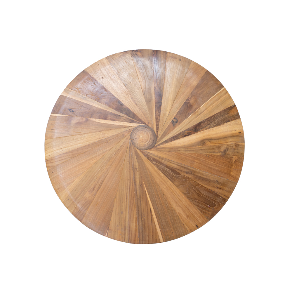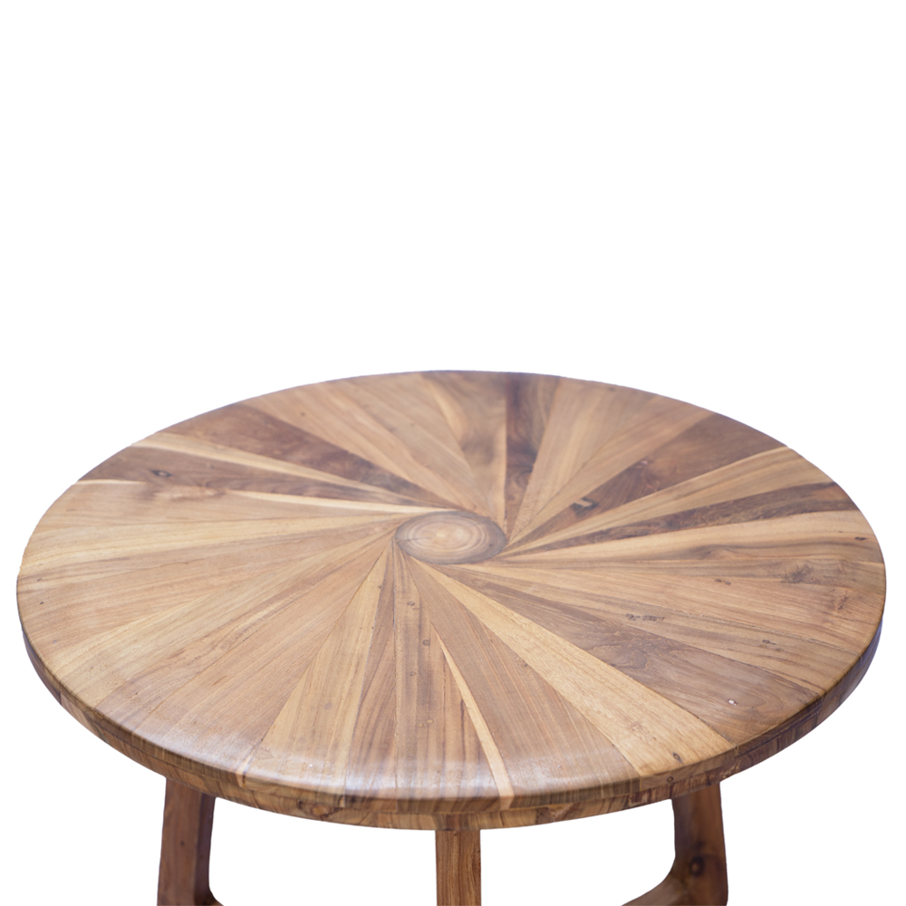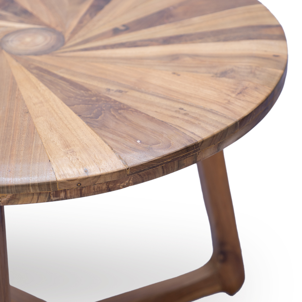 Sono un tavolino da soggiorno e nasco nelle lontane isole indonesiane. Sono stato creato in legno di teak recycled, il mio piano è stato lavorato interamente a mano in stile art decò, in un design senza tempo che darà un tocco minimal al tuo salotto ma allo stesso tempo eleganza. Osserva il mio piano a mosaico, che da forma al simbolo del sole, che si estende dal centro verso l'esterno con i suoi raggi. Mi puoi abbinare alle tue poltrone moderne o classiche; ti servirò d'appoggio per un punto luce o per la tua bevanda preferita da gustare durante le tue serate di lettura o relax. Mi adatto anche per essere trasportato con leggerezza durante i tuoi momenti conviviali con amici o famigliari. Specialmente in compagnia dei miei fratelli, ma anche singolarmente, sarò il perfetto tavolino per i vostri aperitivi o merende in compagnia.