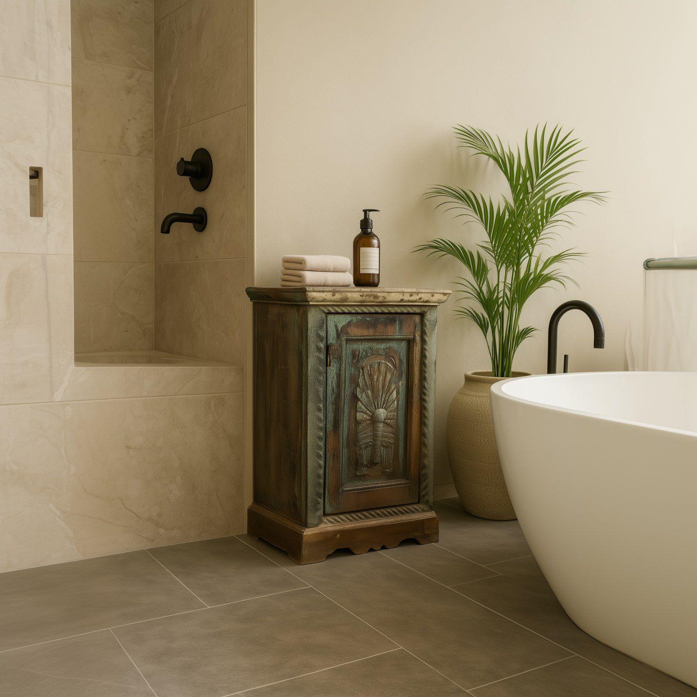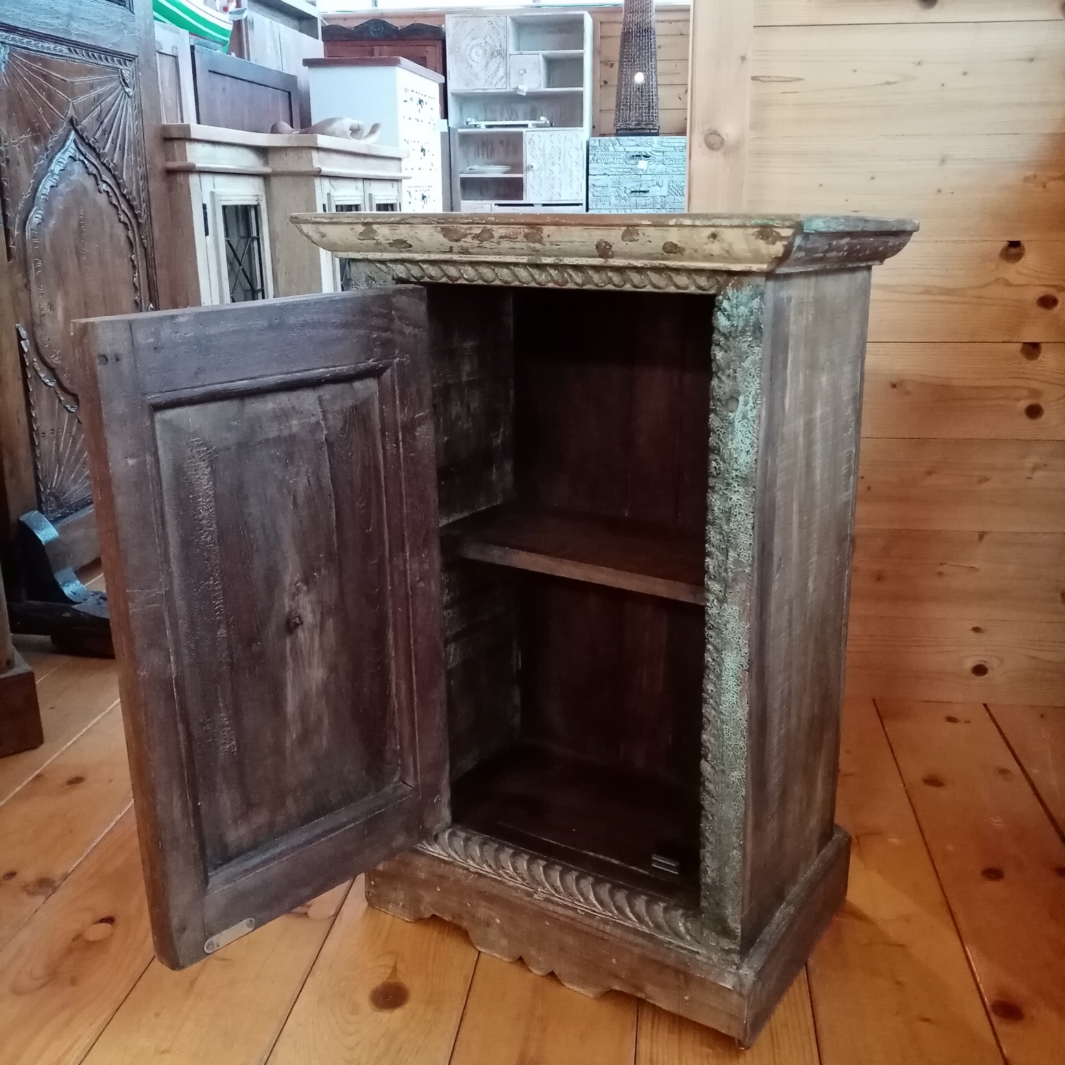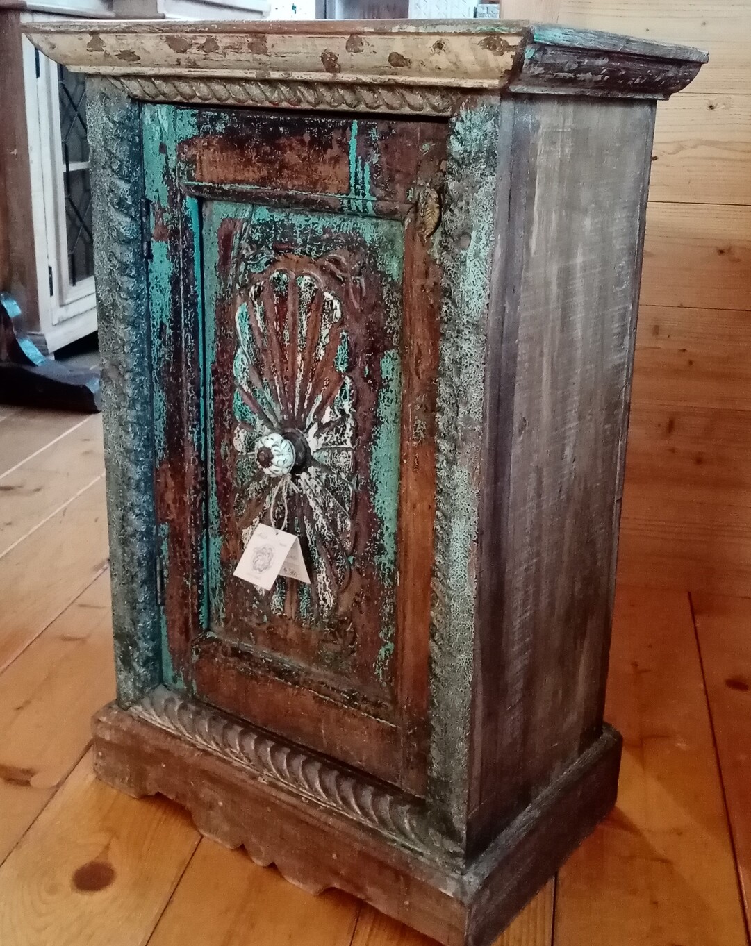 Comodino indiano in legno di teak con 1 anta realizzata con una finestra antica con intagli floreali e pomello in ceramica#1078IN429 -19%