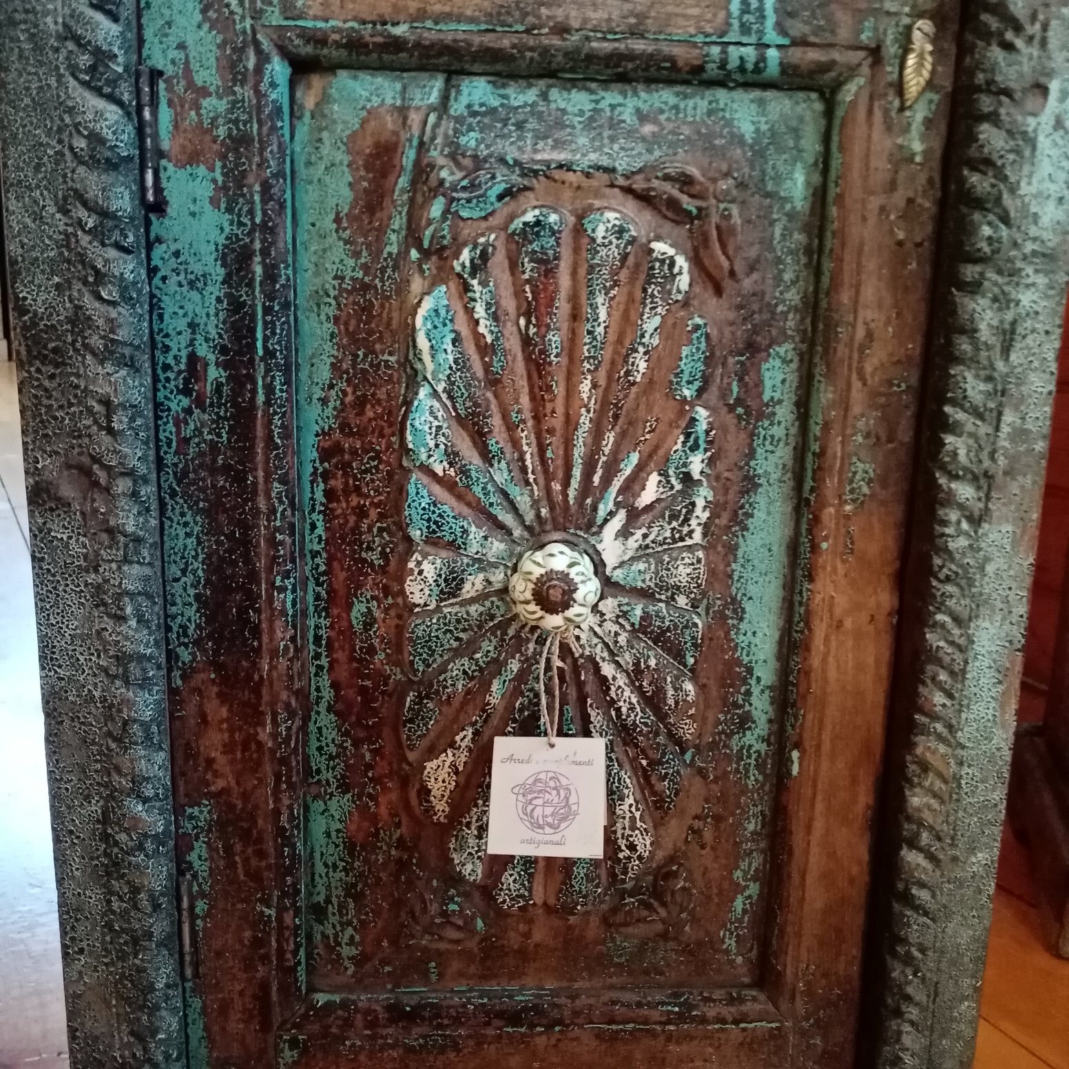 Provenienza: India del Nord, Rajasthan Dimensioni (massimo ingombro): lunghezza cm 90 x profondità cm 52 x altezza cm 180 Materiali: legno massello di mango con ante realizzate in legno di teak recuperato da antichi portali, fregi architettonici e timbri in legno utilizzati per la stampa dei tessuti Lavorazione: intaglio e assemblaggio artigianale, finitura naturale con mantenimento della patina originale Struttura: due ampie ante frontali con chiusura a battente, interno spazioso con ripiani in legno massello Autenticità: non esiste un altro armadio uguale: ogni intaglio, ogni timbro e ogni frammento antico ne fanno un’opera irripetibile di artigianato indiano Perchè sceglierlo: È un capolavoro di artigianato, nato dal recupero di elementi antichi carichi di significato Ogni dettaglio inciso racconta simboli di protezione, prosperità e buon auspicio Dona calore, forza e fascino alla casa grazie alle sfumature naturali del legno di mango Trasforma ogni ambiente in uno spazio d’anima, dove storia e design si incontrano Sono un armadio nato a Jaipur, in India e porto con me la memoria di un tempo lontano. Le mie ante raccontano un mosaico di legni antichi, provenienti da fregi, portali e antichi timbri che un tempo venivano usati per la stampa dei tessuti nelle botteghe artigiane del Rajasthan. Ogni frammento è unico, inciso a mano, e custodisce simboli di protezione e armonia tramandati dalla tradizione indiana. Nel tuo spazio saprò unire la raffinatezza dell’Oriente alla funzionalità contemporanea, aggiungendo calore, carattere e un tocco di mistero che catturerà ogni sguardo. Importato da Colori dal Mondo s.r.l.
