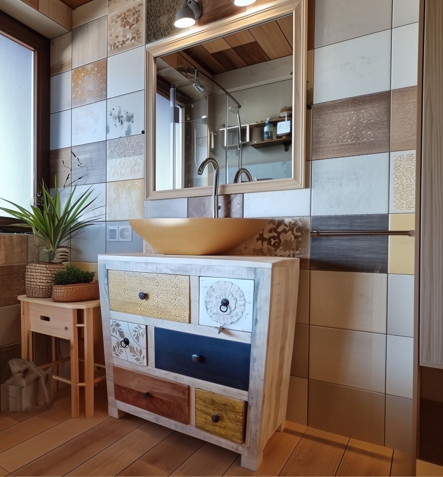 Armadio / Credenza con ante lavorate a mosaico realizzate con il recupero di pezzi antichi di palazzi storici e vecchi timbri usati per la stampa #3103IN2390