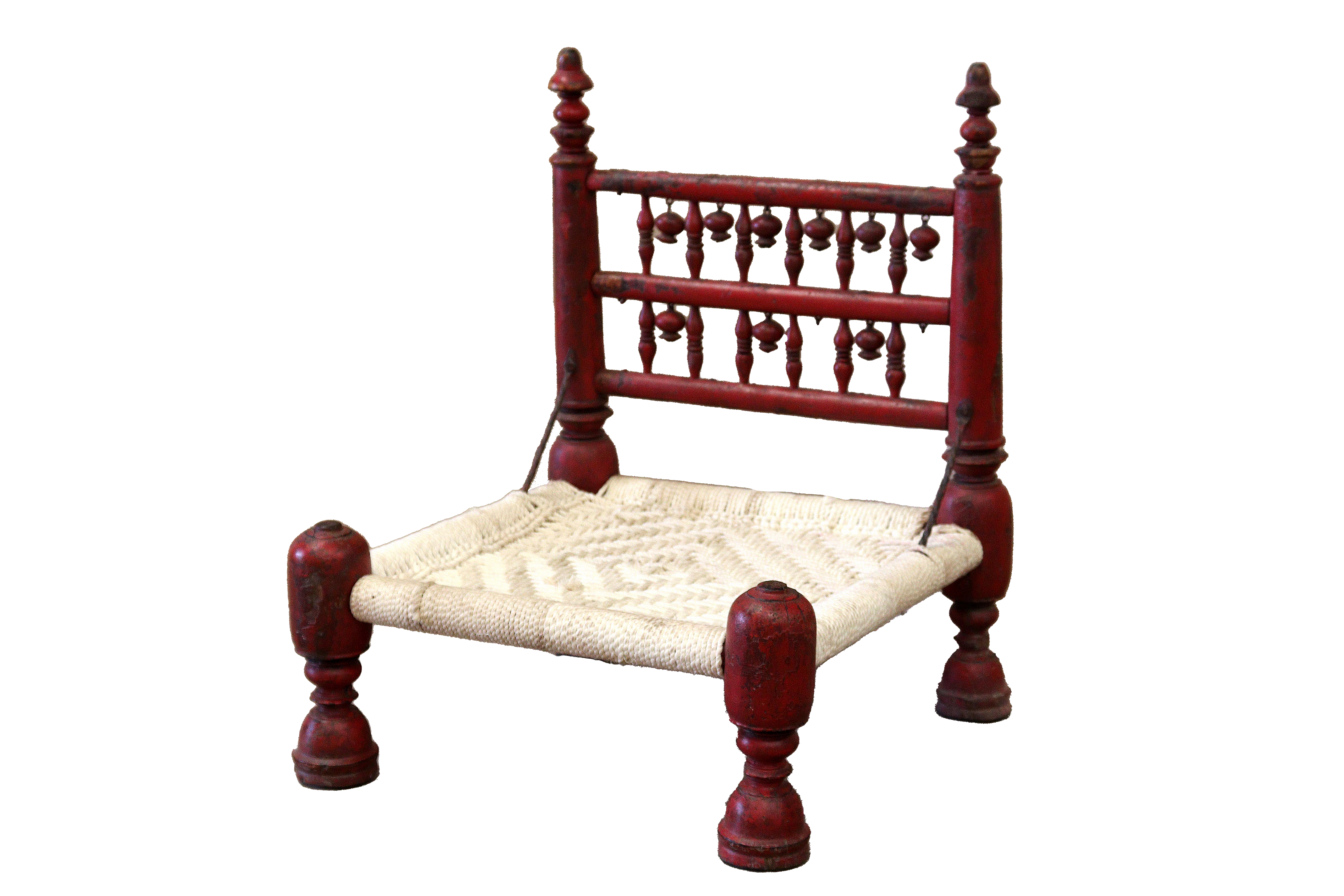 Sedia bassa afghana antica in legno di teak con seduta intrecciata a mano in cotone #3115IN390
