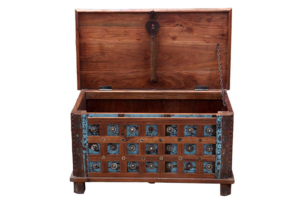 Baule indiano in legno di teak con frontale recuperato da un vecchio portale con finitura sui toni del blu #3099IN690
