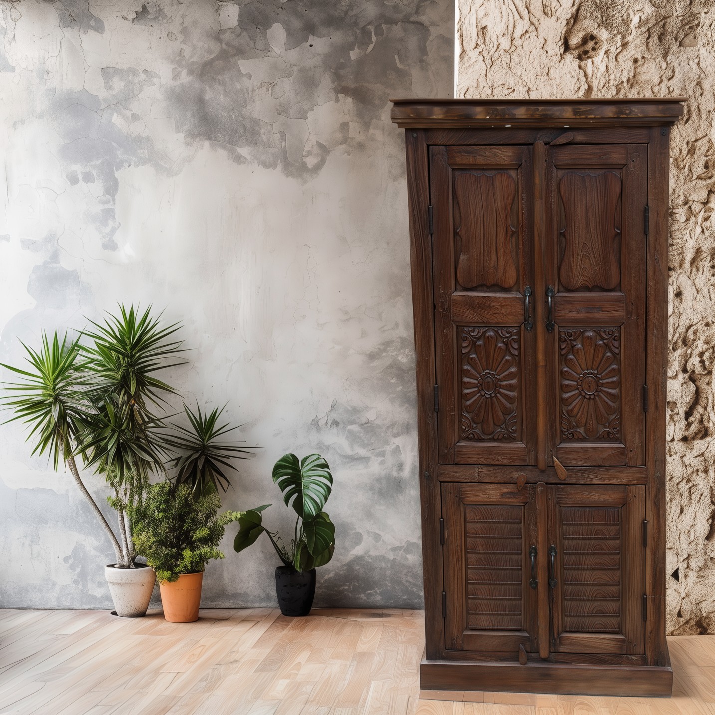 Provenienza: India del Nord, Rajasthan Dimensioni (massimo ingombro): lunghezza cm 90 x profondità cm 52 x altezza cm 180 Materiali: legno massello di mango con ante realizzate in legno di teak recuperato da antichi portali, fregi architettonici e timbri in legno utilizzati per la stampa dei tessuti Lavorazione: intaglio e assemblaggio artigianale, finitura naturale con mantenimento della patina originale Struttura: due ampie ante frontali con chiusura a battente, interno spazioso con ripiani in legno massello Autenticità: non esiste un altro armadio uguale: ogni intaglio, ogni timbro e ogni frammento antico ne fanno un’opera irripetibile di artigianato indiano Perchè sceglierlo: È un capolavoro di artigianato, nato dal recupero di elementi antichi carichi di significato Ogni dettaglio inciso racconta simboli di protezione, prosperità e buon auspicio Dona calore, forza e fascino alla casa grazie alle sfumature naturali del legno di mango Trasforma ogni ambiente in uno spazio d’anima, dove storia e design si incontrano Sono un armadio nato a Jaipur, in India e porto con me la memoria di un tempo lontano. Le mie ante raccontano un mosaico di legni antichi, provenienti da fregi, portali e antichi timbri che un tempo venivano usati per la stampa dei tessuti nelle botteghe artigiane del Rajasthan. Ogni frammento è unico, inciso a mano, e custodisce simboli di protezione e armonia tramandati dalla tradizione indiana. Nel tuo spazio saprò unire la raffinatezza dell’Oriente alla funzionalità contemporanea, aggiungendo calore, carattere e un tocco di mistero che catturerà ogni sguardo. Importato da Colori dal Mondo s.r.l.