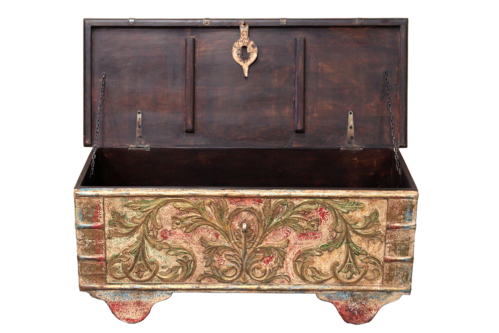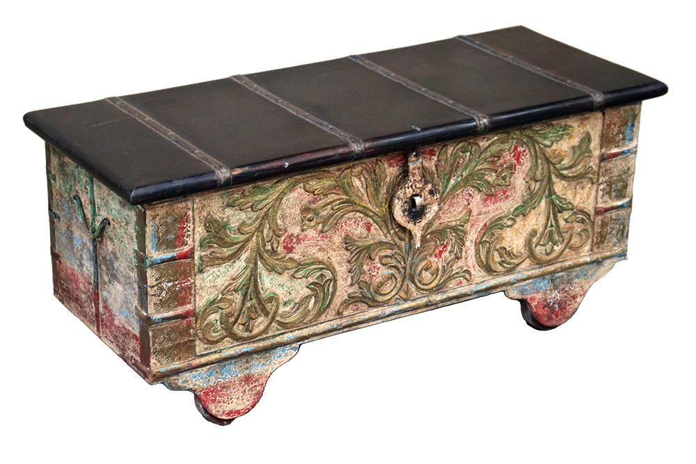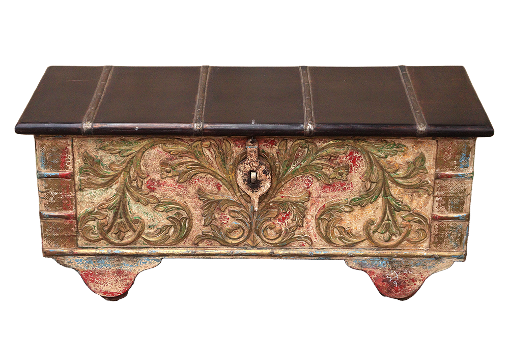 Baule indiano tipo "mod. forziere" in legno di palissandro con parte frontale intagliato con motivi floreali #3097IN890