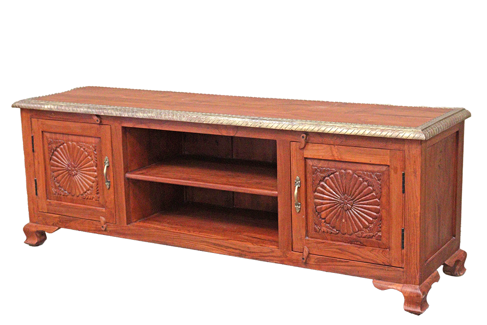 Porta Tv indiano in legno di teak con profilo in ottone e con 2 ante realizzate con recuperate da vecchie finestre di palazzi #3108IN1390 -18%