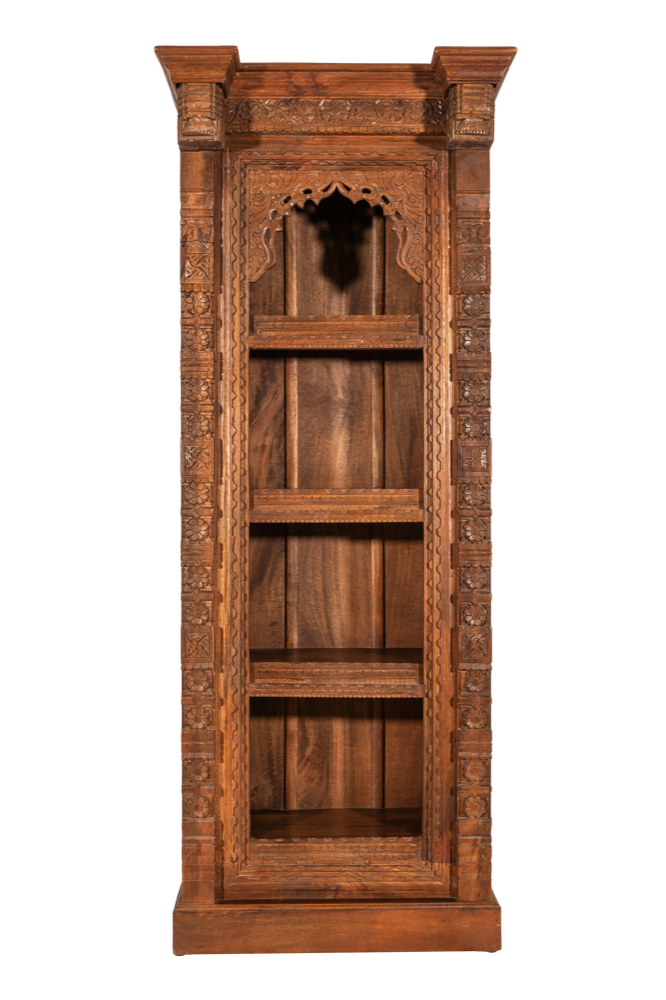 Io, raffinata libreria, sarò come finestra sui vostri oggetti personali. Proprio così come sono stata finestra sulla meravigliosa città dorata di Jaisalmer. La mia facciata infatti, è composta da diverse parti recuperate da lussureggianti palazzi di maharaja, al nord dell'antica India. Osservate i miei intagli, resi nel dettaglio da mani artigiane nel mio pregiato legno di teak: simbologie geometriche, foglie, fiori e forme sinuose. Ogni centimetro della mia superficie è curato in ogni particolare e ogni movimento. Inseritemi nei vostri spazi e riempite i miei eleganti ripiani con i vostri oggetti, saranno incorniciati nella danza dei miei dettagli, raffinati e selvaggi come la Natura che rappresentano.