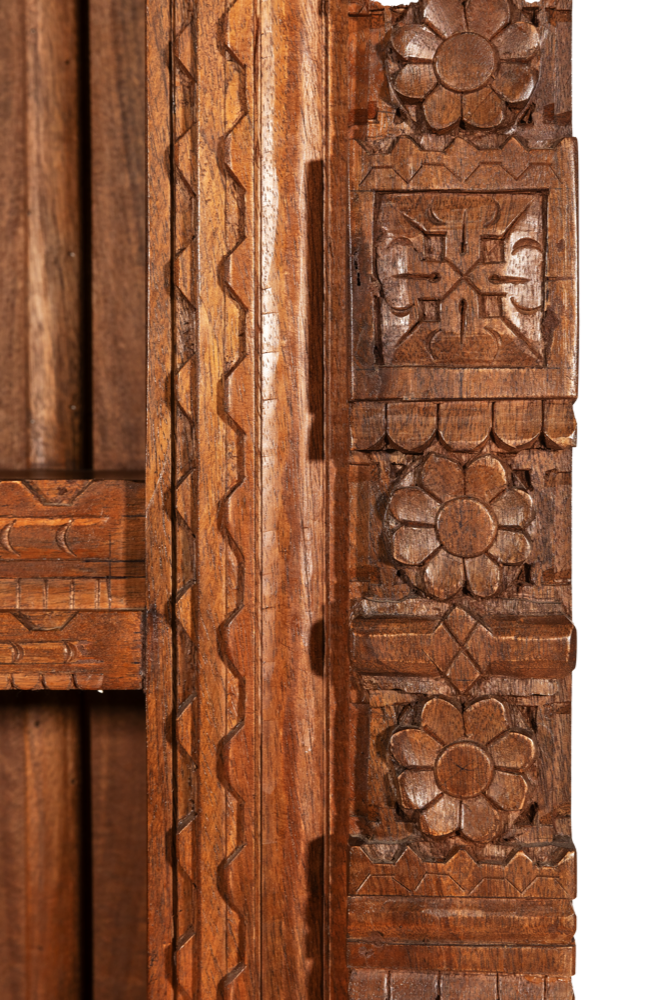 Lavorazioni: Struttura interamente intagliata a mano, con decori floreali, motivi geometrici e cornici tipiche delle finestre e portali dei palazzi Rajput. Il legno recuperato viene pulito, trattato e assemblato manualmente, mantenendo la patina autentica e le tracce del tempo. Finitura con oli e cere naturali che proteggono il materiale senza alterarne la bellezza originaria.