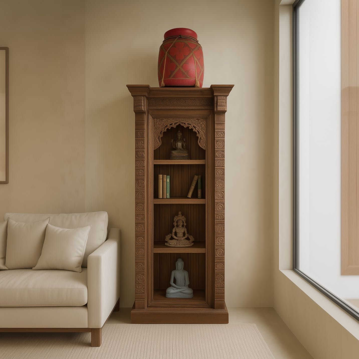 Struttura: Libreria con quattro ripiani interni racchiusi da un’imponente cornice scolpita a rilievo. La cornice superiore, con fregi traforati, richiama le tipiche aperture architettoniche indiane (jharokha), rendendo il pezzo non solo funzionale ma anche altamente decorativo. La base solida e il frontale riccamente lavorato conferiscono equilibrio tra robustezza e raffinatezza estetica.