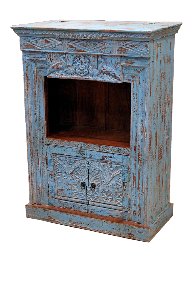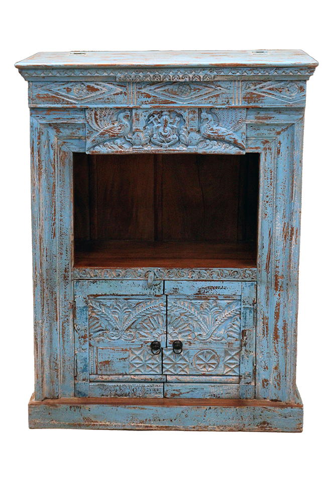 Credenza con ripiano e 2 ante / Baule indiano in legno di teak realizzato nella città blu di Jodphur con intaglio centrale raffigurazione di Ganesh #3095IN1590 -18%