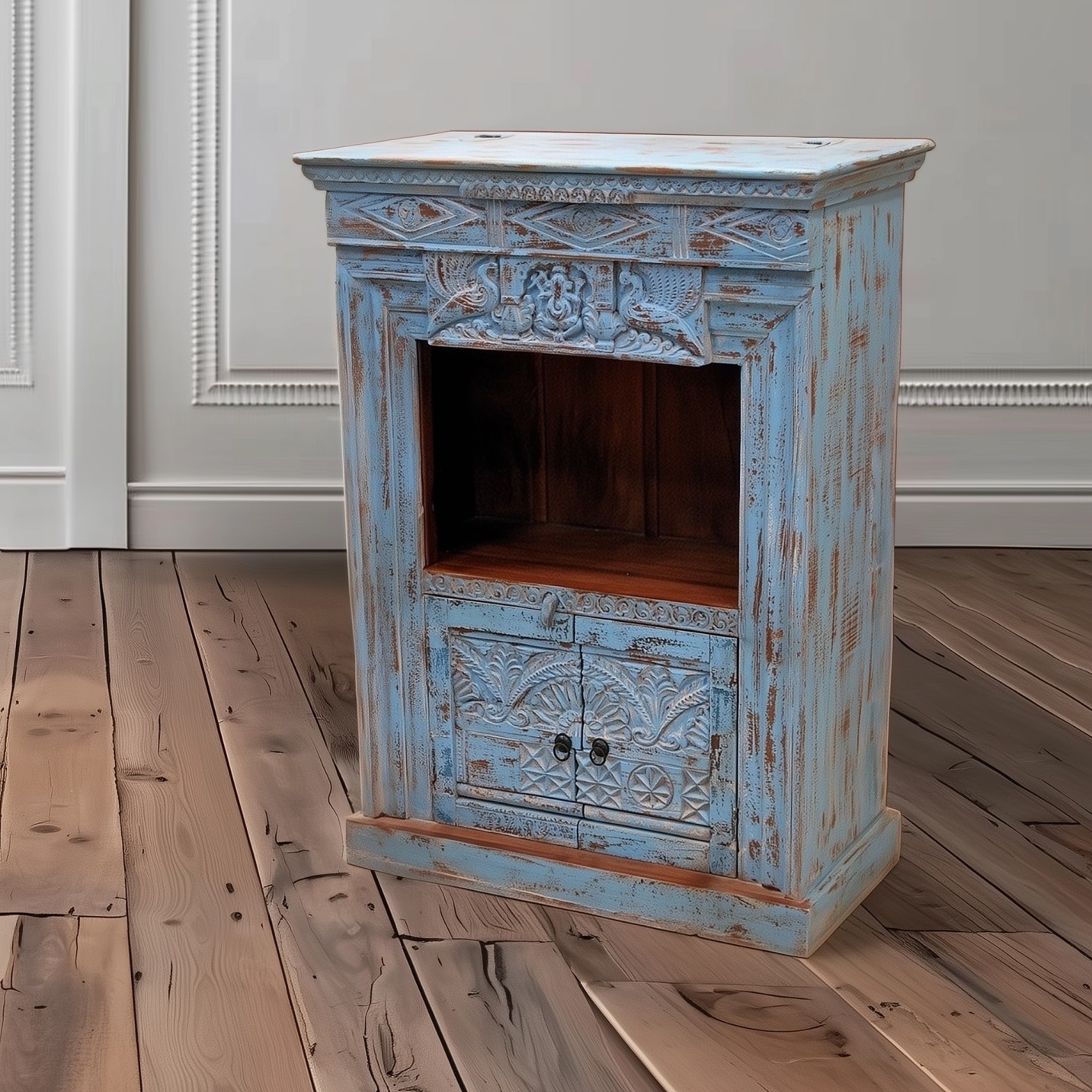 Credenza con ripiano e 2 ante / Baule indiano in legno di teak realizzato nella città blu di Jodphur con intaglio centrale raffigurazione di Ganesh #3095IN1590
