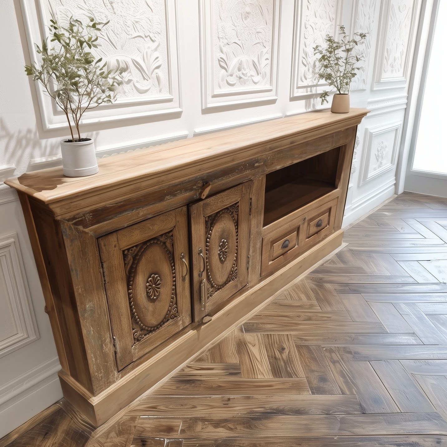 Credenza / Porta TV indiano in legno di teak recuperato da cornici ed ante da finestre da antichi palazzi storici del Rajasthan #3111IN1790
