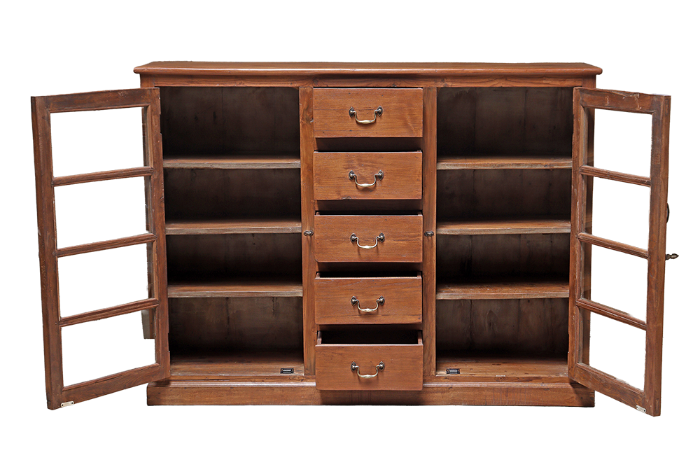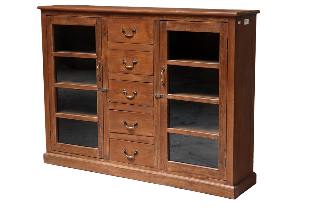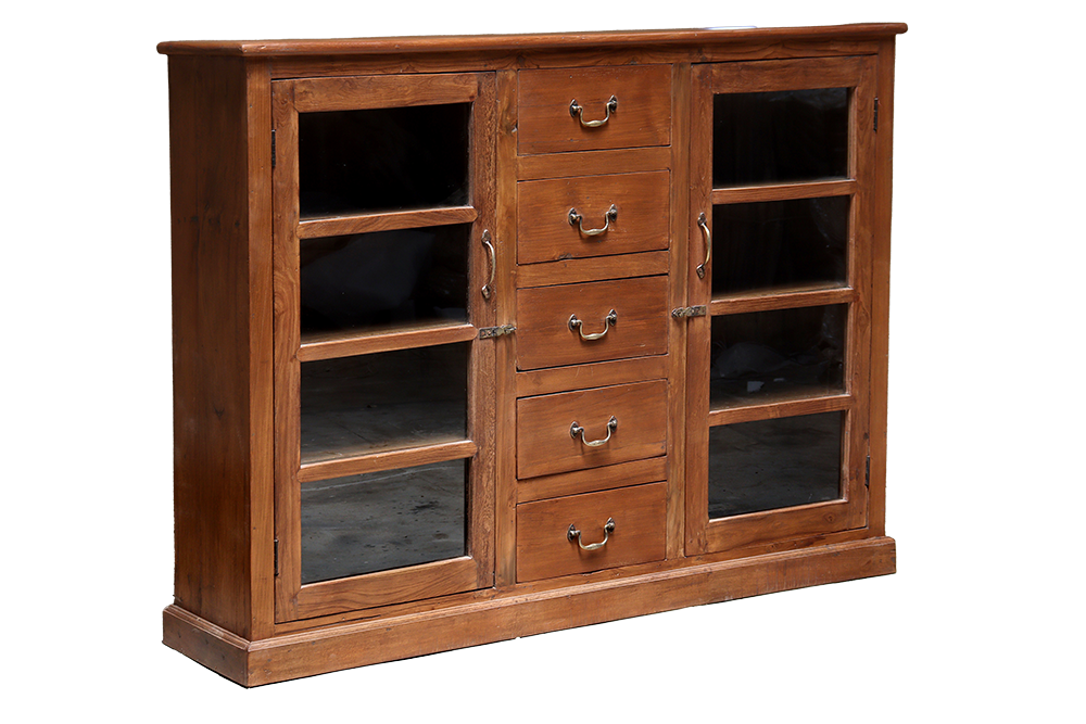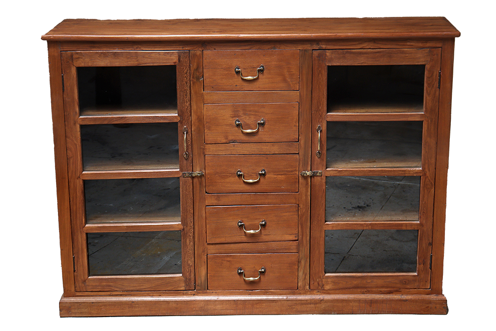 Credenza indiana antica in legno di teak con 2 ante vetri e 5 cassetti recuperata da una gioielleria #3252IN2790