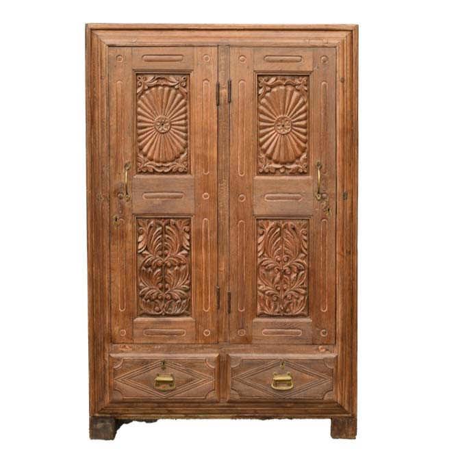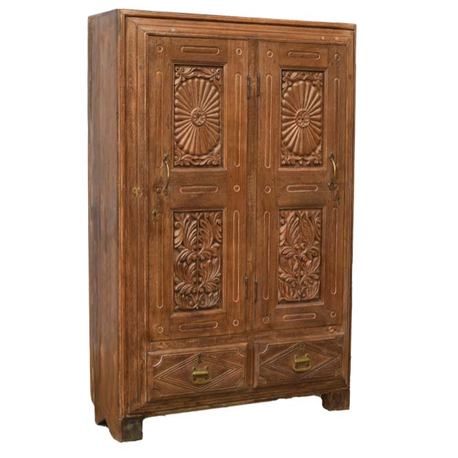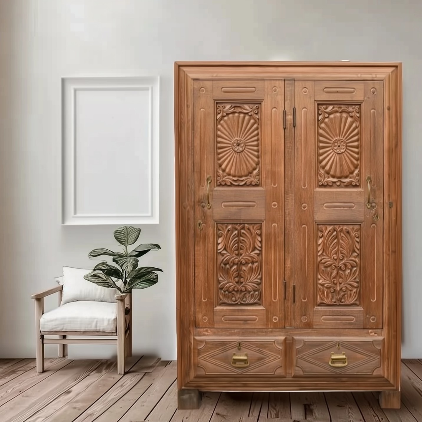 Provenienza: India del Nord, Rajasthan Dimensioni (massimo ingombro): lunghezza cm 90 x profondità cm 52 x altezza cm 180 Materiali: legno massello di mango con ante realizzate in legno di teak recuperato da antichi portali, fregi architettonici e timbri in legno utilizzati per la stampa dei tessuti Lavorazione: intaglio e assemblaggio artigianale, finitura naturale con mantenimento della patina originale Struttura: due ampie ante frontali con chiusura a battente, interno spazioso con ripiani in legno massello Autenticità: non esiste un altro armadio uguale: ogni intaglio, ogni timbro e ogni frammento antico ne fanno un’opera irripetibile di artigianato indiano Perchè sceglierlo: È un capolavoro di artigianato, nato dal recupero di elementi antichi carichi di significato Ogni dettaglio inciso racconta simboli di protezione, prosperità e buon auspicio Dona calore, forza e fascino alla casa grazie alle sfumature naturali del legno di mango Trasforma ogni ambiente in uno spazio d’anima, dove storia e design si incontrano Sono un armadio nato a Jaipur, in India e porto con me la memoria di un tempo lontano. Le mie ante raccontano un mosaico di legni antichi, provenienti da fregi, portali e antichi timbri che un tempo venivano usati per la stampa dei tessuti nelle botteghe artigiane del Rajasthan. Ogni frammento è unico, inciso a mano, e custodisce simboli di protezione e armonia tramandati dalla tradizione indiana. Nel tuo spazio saprò unire la raffinatezza dell’Oriente alla funzionalità contemporanea, aggiungendo calore, carattere e un tocco di mistero che catturerà ogni sguardo. Importato da Colori dal Mondo s.r.l.