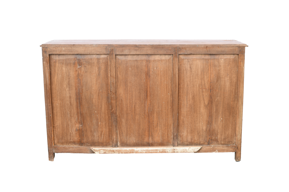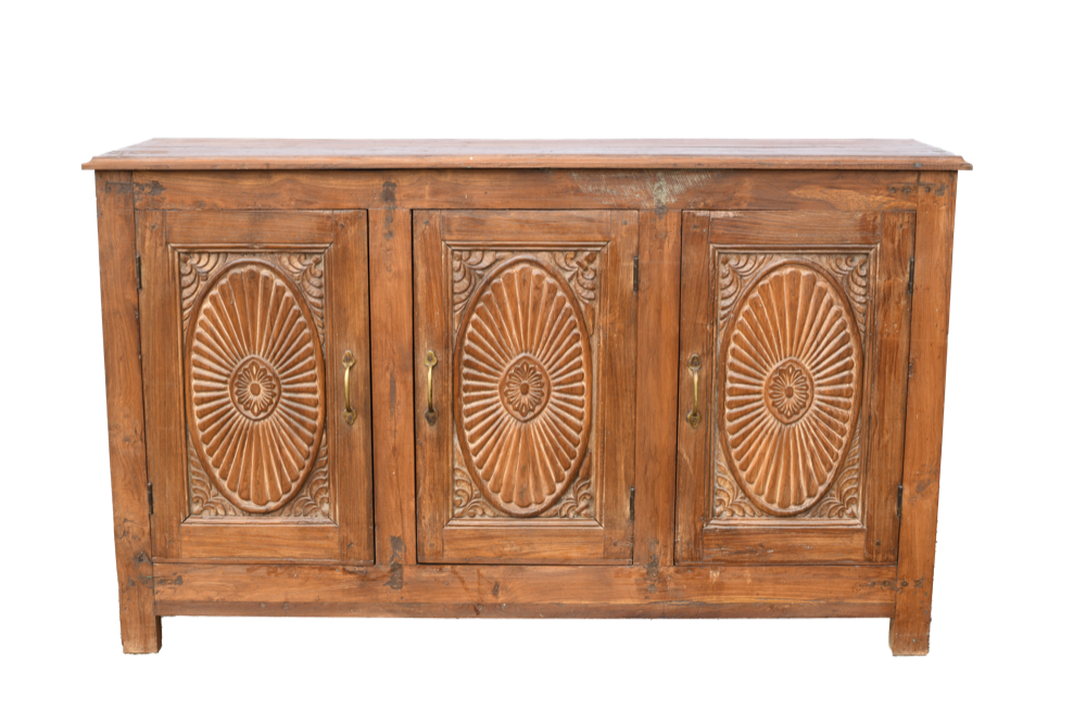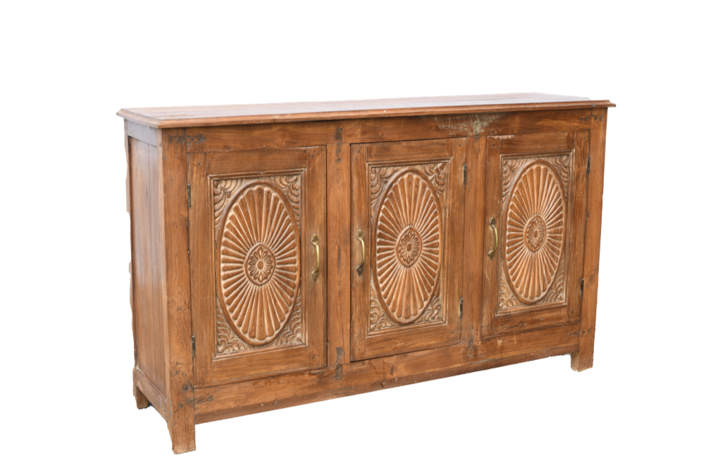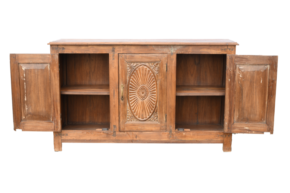 Credenza indiana in legno di teak con 3 ante recuperate da vecchie finestre intagliate #3019IN1790