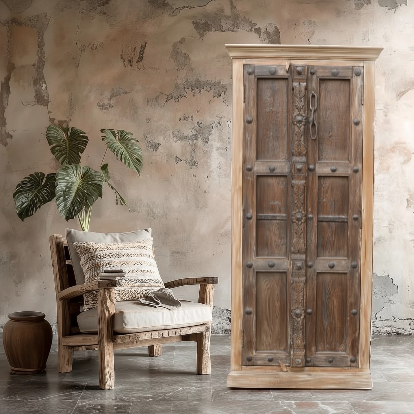 Provenienza: India del Nord, Rajasthan Dimensioni (massimo ingombro): lunghezza cm 90 x profondità cm 52 x altezza cm 180 Materiali: legno massello di mango con ante realizzate in legno di teak recuperato da antichi portali, fregi architettonici e timbri in legno utilizzati per la stampa dei tessuti Lavorazione: intaglio e assemblaggio artigianale, finitura naturale con mantenimento della patina originale Struttura: due ampie ante frontali con chiusura a battente, interno spazioso con ripiani in legno massello Autenticità: non esiste un altro armadio uguale: ogni intaglio, ogni timbro e ogni frammento antico ne fanno un’opera irripetibile di artigianato indiano Perchè sceglierlo: È un capolavoro di artigianato, nato dal recupero di elementi antichi carichi di significato Ogni dettaglio inciso racconta simboli di protezione, prosperità e buon auspicio Dona calore, forza e fascino alla casa grazie alle sfumature naturali del legno di mango Trasforma ogni ambiente in uno spazio d’anima, dove storia e design si incontrano Sono un armadio nato a Jaipur, in India e porto con me la memoria di un tempo lontano. Le mie ante raccontano un mosaico di legni antichi, provenienti da fregi, portali e antichi timbri che un tempo venivano usati per la stampa dei tessuti nelle botteghe artigiane del Rajasthan. Ogni frammento è unico, inciso a mano, e custodisce simboli di protezione e armonia tramandati dalla tradizione indiana. Nel tuo spazio saprò unire la raffinatezza dell’Oriente alla funzionalità contemporanea, aggiungendo calore, carattere e un tocco di mistero che catturerà ogni sguardo. Importato da Colori dal Mondo s.r.l.