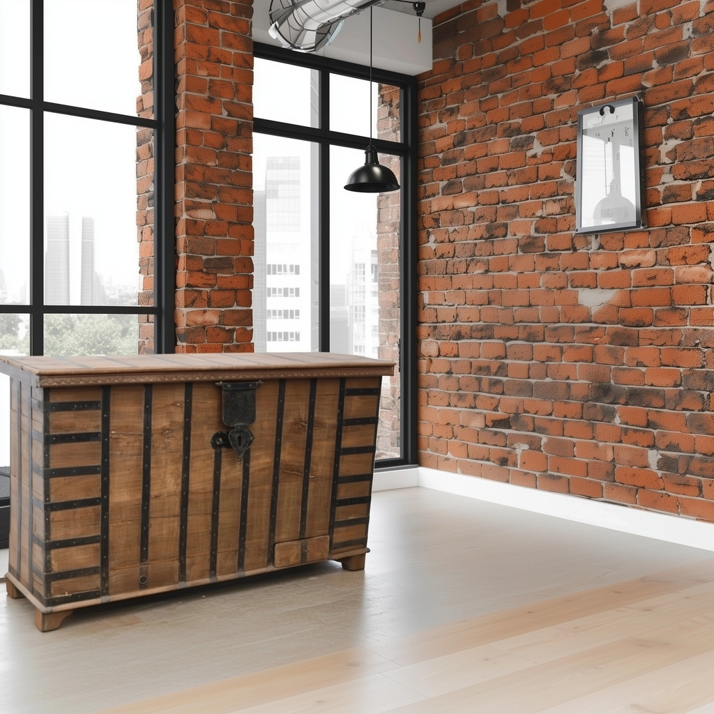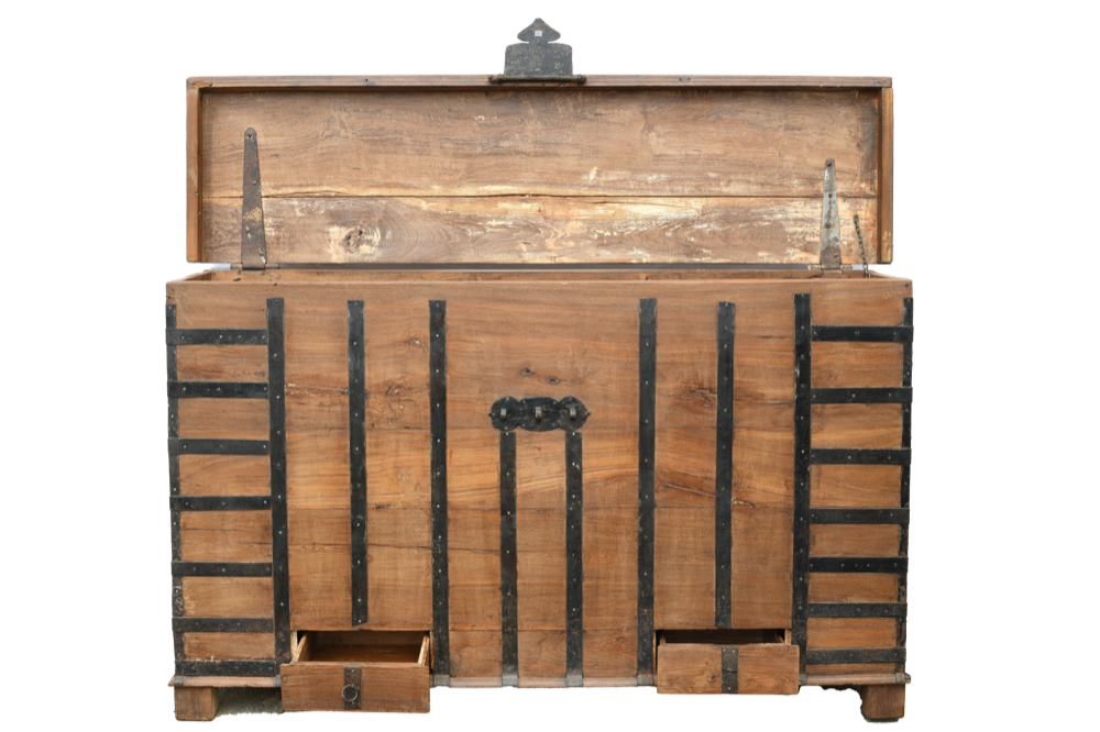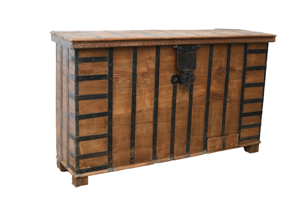 Sono un baule antico in stile forziere, nato in India e creato in legno di teak, forte e resistente come le storie che custodisco. Le mie forme ricordano i tesori di tempi lontani, quando il mare portava spezie e preziosi manoscritti da proteggere con cura. La mia struttura solida è impreziosita da inserti in ferro, battuti e lavorati a mano, che mi donano un carattere audace e senza tempo.