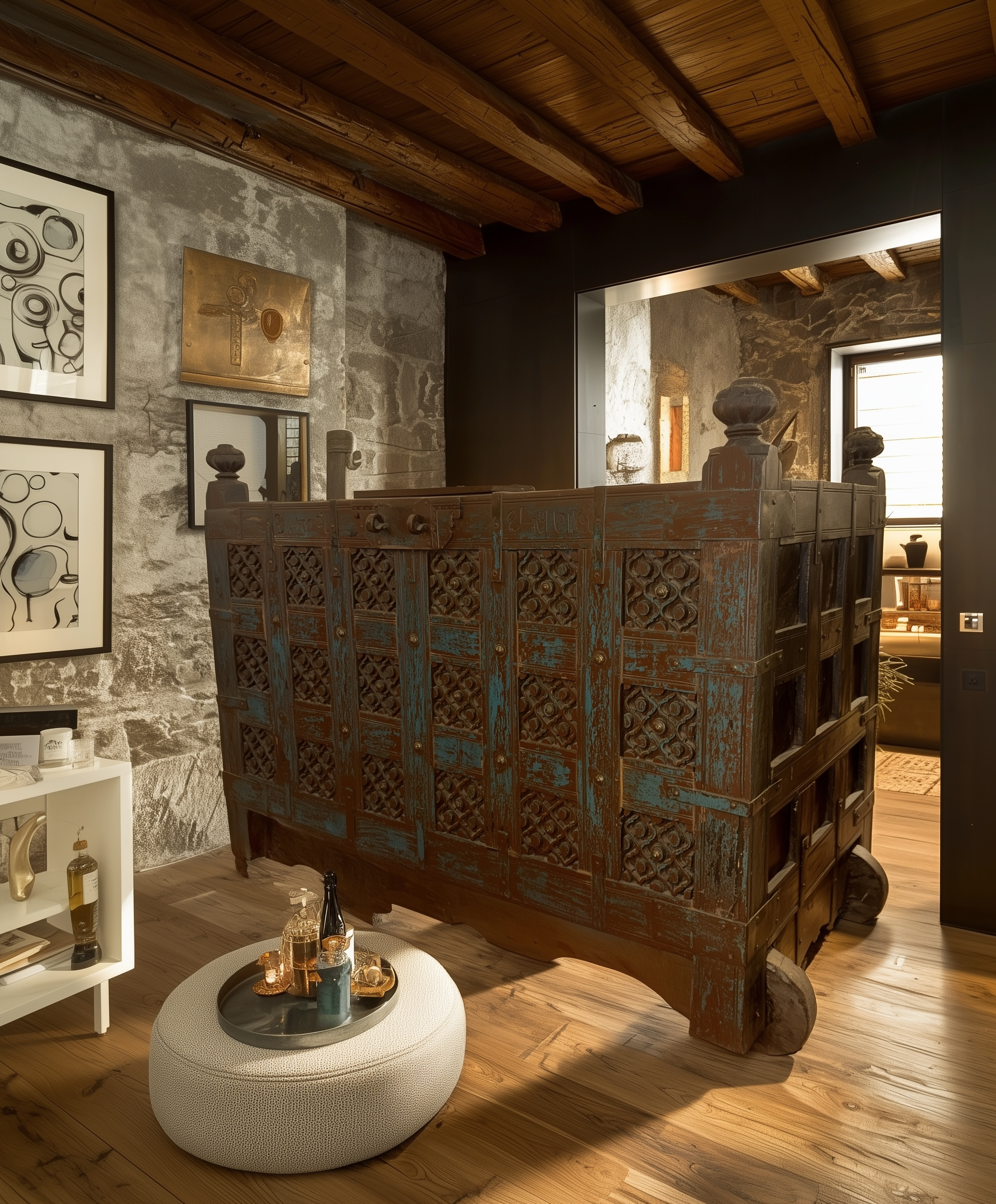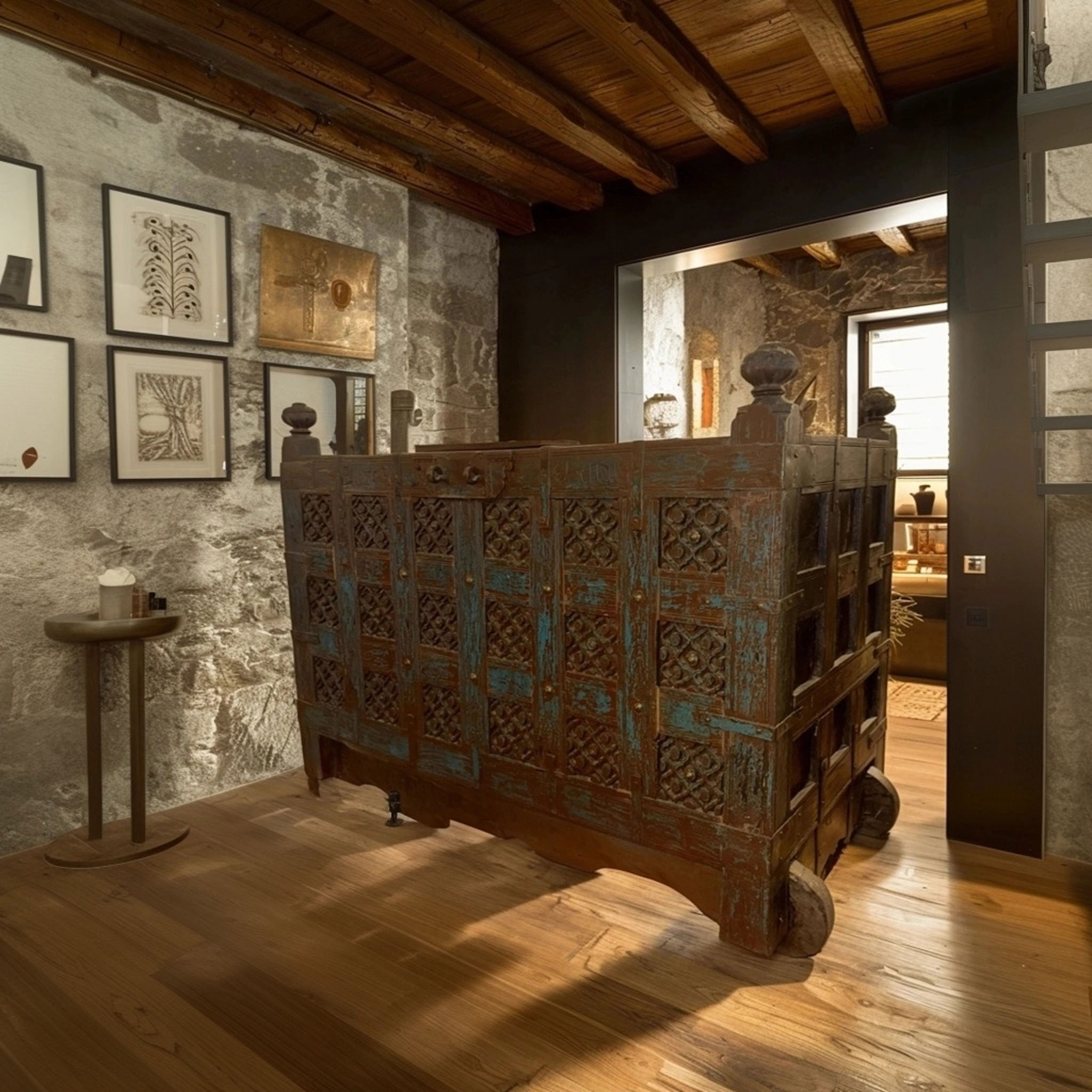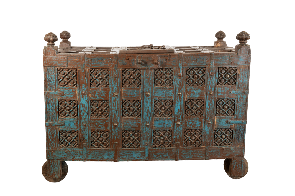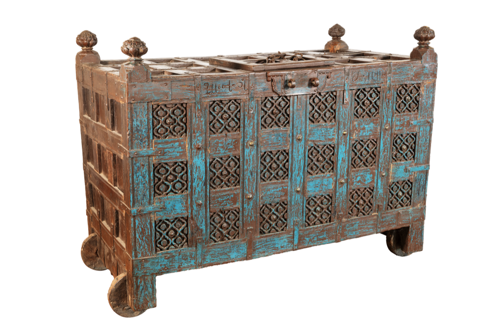 Struttura: Solida e imponente, con pannellature a griglia e sportelli intagliati. Le sfere superiori e la base a ruote tornite testimoniano il suo utilizzo originario come dowry chest (cassapanca nuziale), spesso collocata all’ingresso delle case nobili del Rajasthan come simbolo di prosperità e accoglienza.