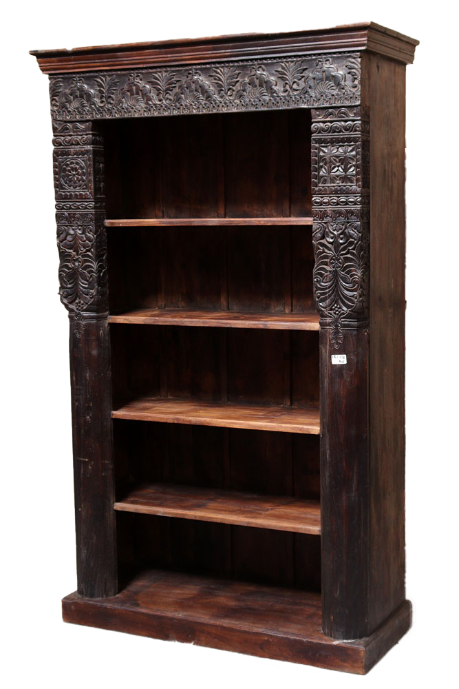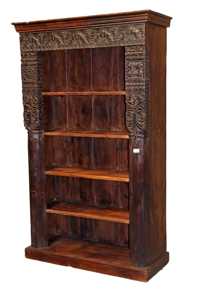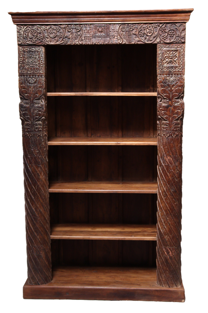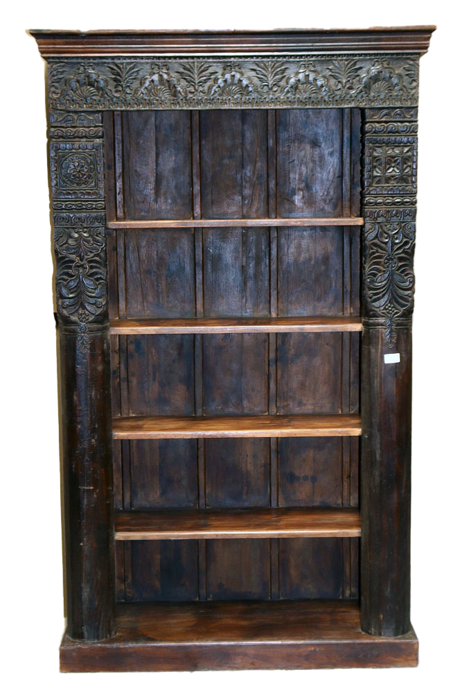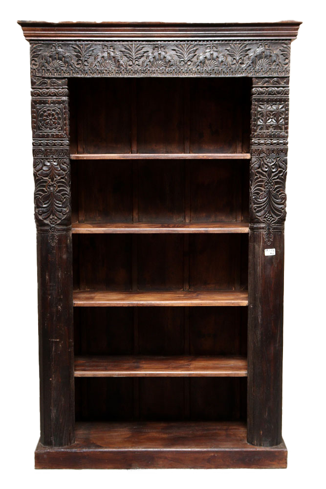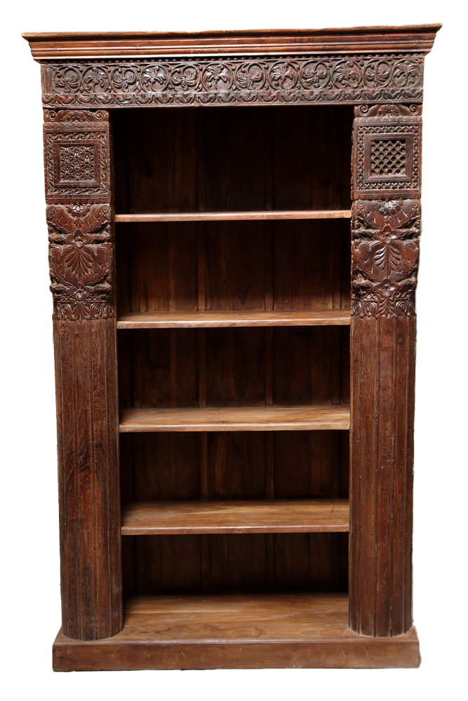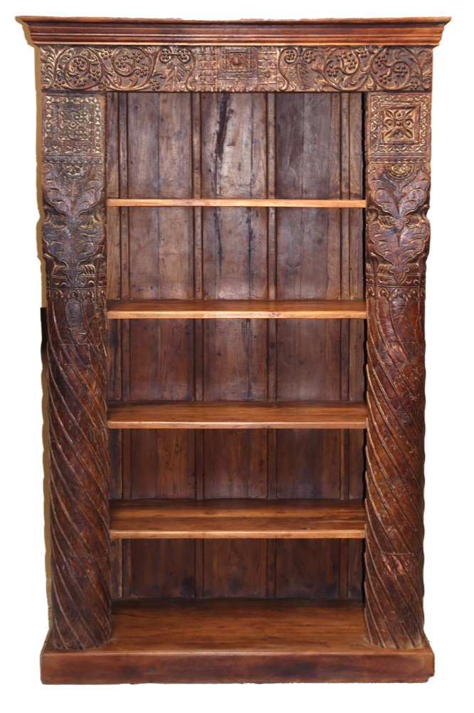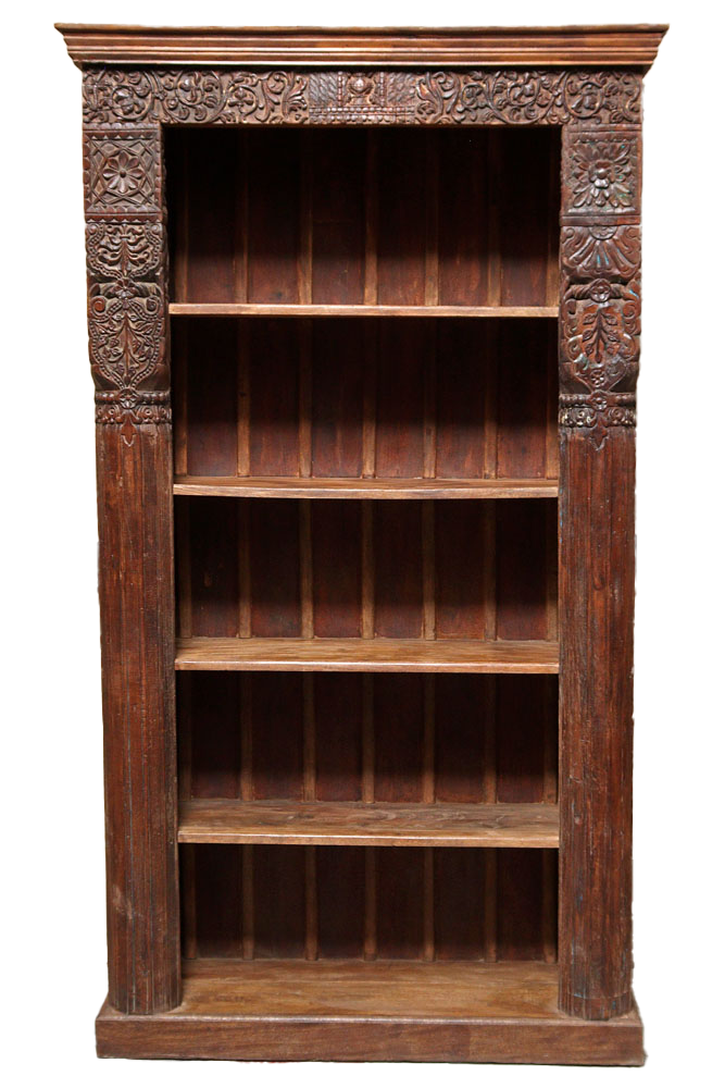 Libreria indiana in legno di teak realizzata con il recupero di antiche colonne e cornici di vecchi palazzi #3323IN3490
