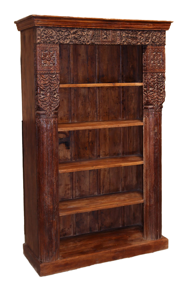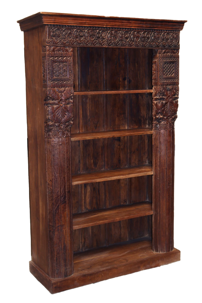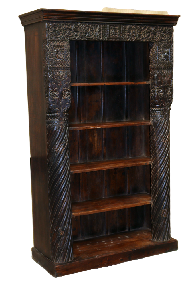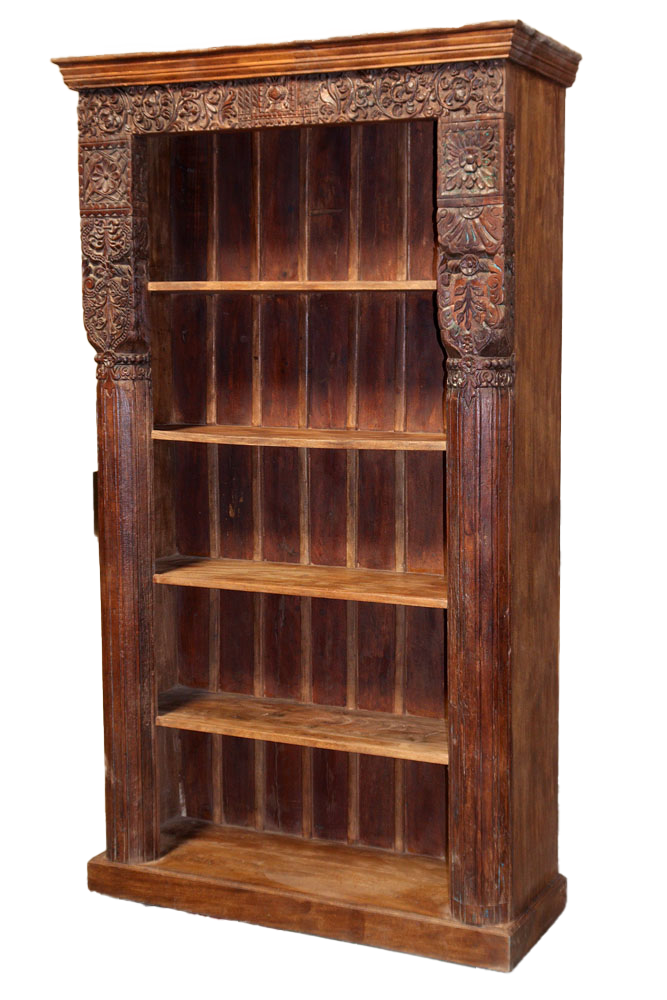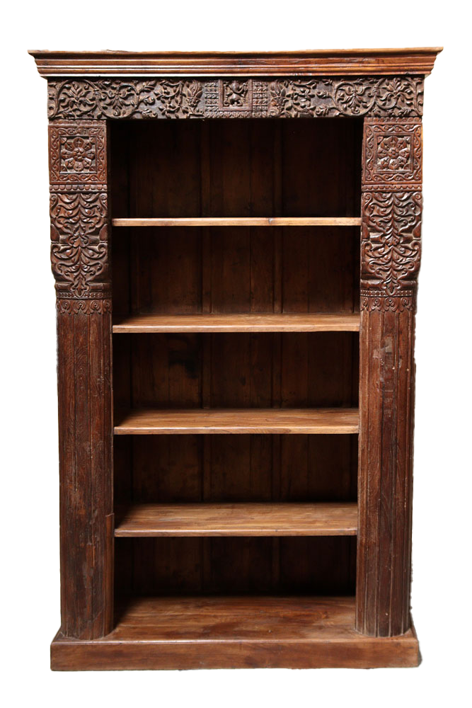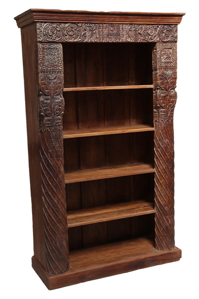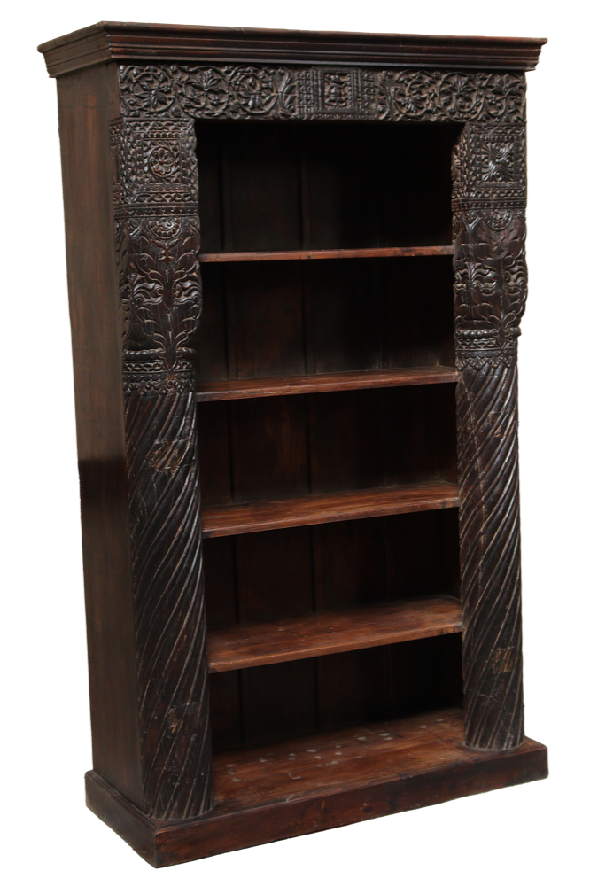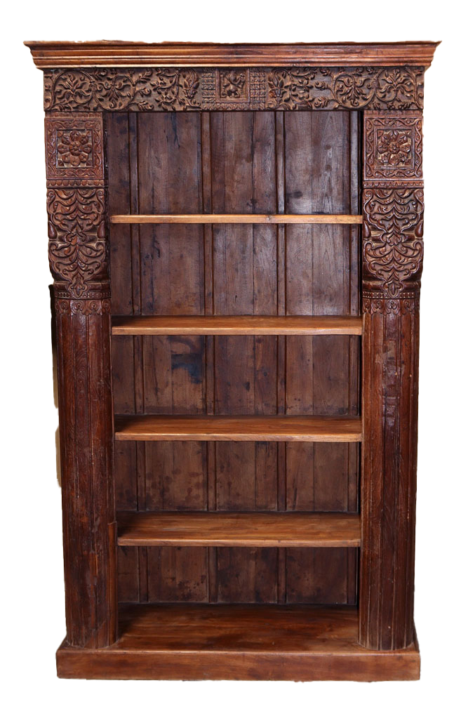 Libreria indiana in legno di teak realizzata con il recupero di antiche colonne e cornici di vecchi palazzi #3323IN3490