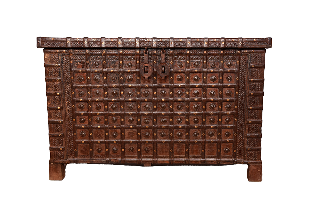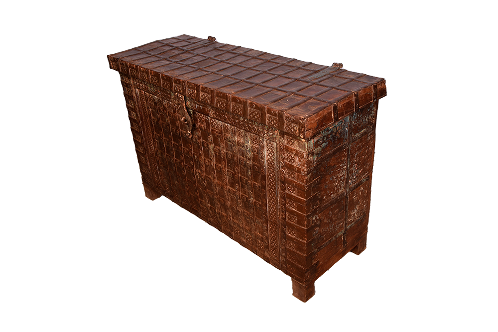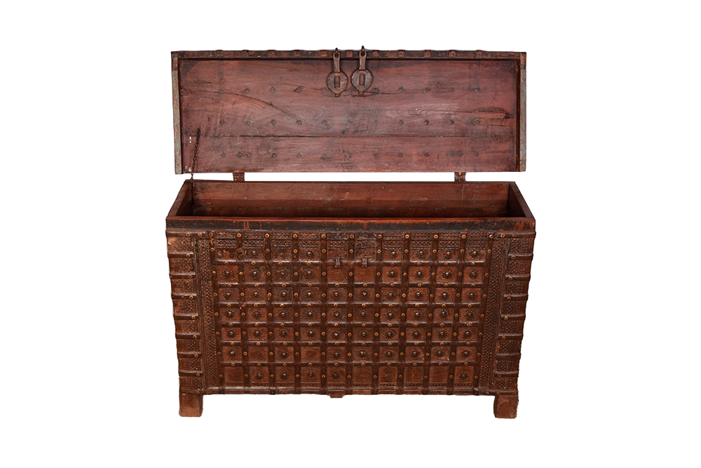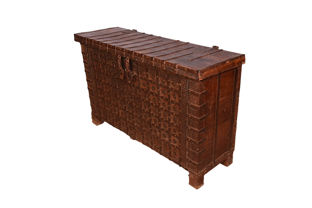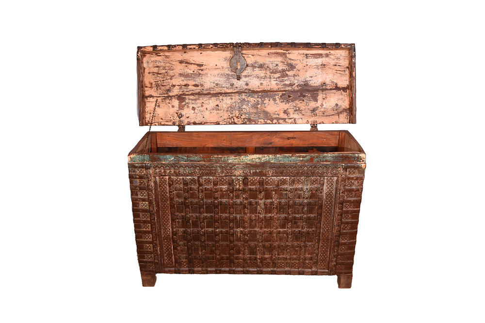 Sono un antico baule, nato come forziere e trasformato in un prezioso custode di storie e segreti. Realizzato in India, porto con me il fascino di terre lontane e la maestria degli artigiani che mi hanno dato vita. Il mio corpo è scolpito nel legno di teak, forte e nobile, e sono inciso con minuziosi intagli di precisione e geometrie.