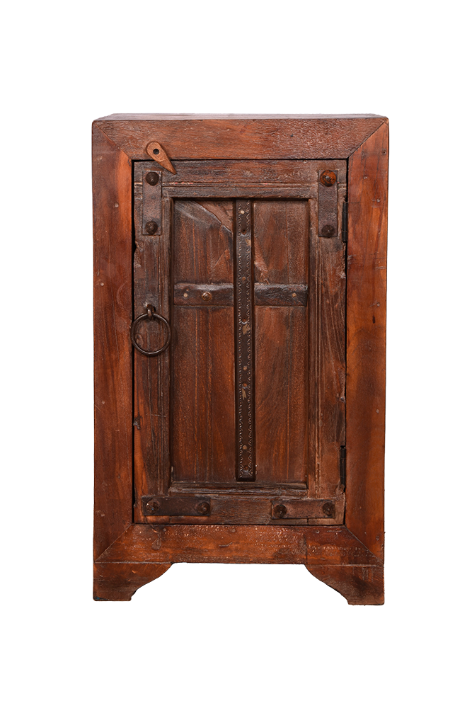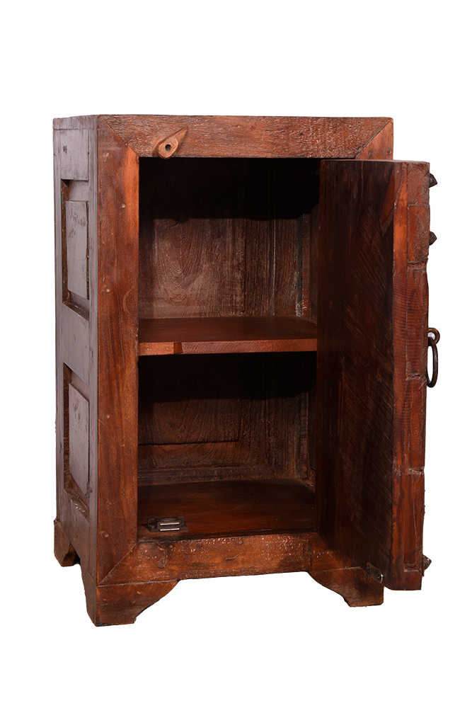 Comodino indiano in legno di teak con anta recuperata da un portale indiano #3175IN449