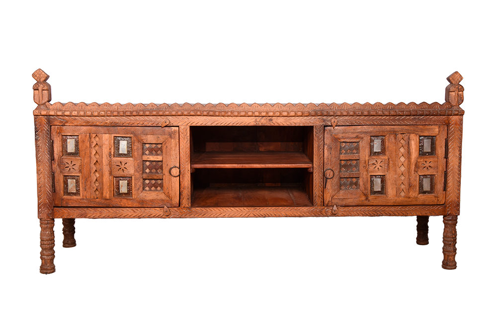 Porta TV indiano in legno di teak con 2 ante con specchietti ed intagli #3181IN1190 -18%