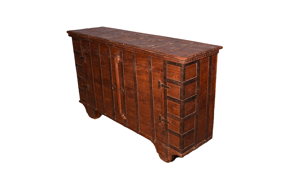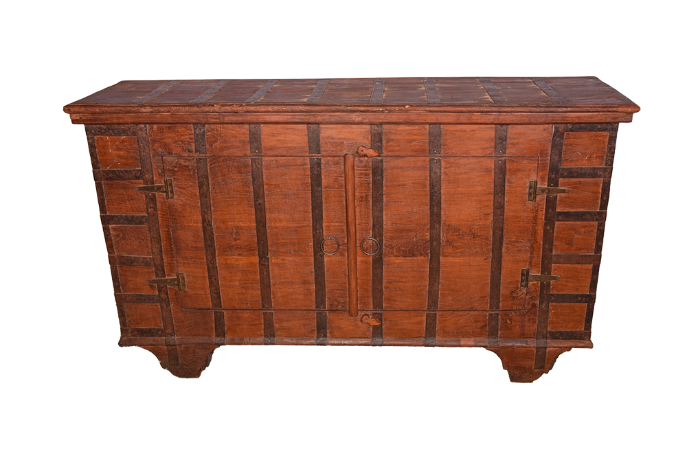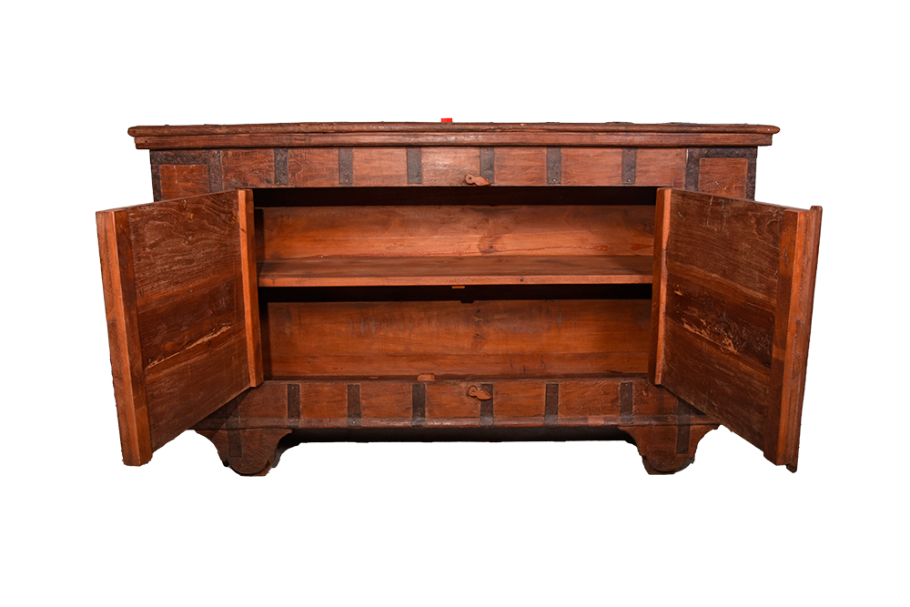 Credenza indiana in legno di teak con inserti in ferro e 2 ante realizzata con il recupero di un vecchio forziere #3183IN1990