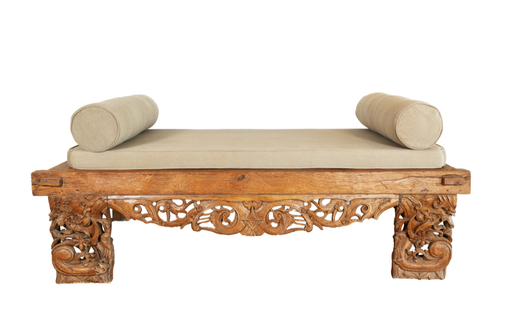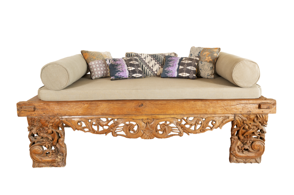 Nasco come letto da giorno per le vostre dimore, ma sono molto di più. Eleganza, raffinatezza. Sono maestoso, confortevole, una coccola per ogni vostro momento di relax. So di essere questo e molto più. Osserva le mie gambe, solide ma così elegantemente intagliate nel mio legno di teak con simboli spirituali e di buon auspicio tradizionali della Isola degli dei, la lontana Giava dove sono stato costruito alla fine dell'ottocento. Accarezza i miei cuscini, morbidi e delicati, ti vogliono abbracciare. Sono il pezzo mancante al tuo arredo, il tuo rifugio orientale, ovunque deciderai di posizionarmi nella tua dimora, all'interno di casa, al sole o sotto le stelle.