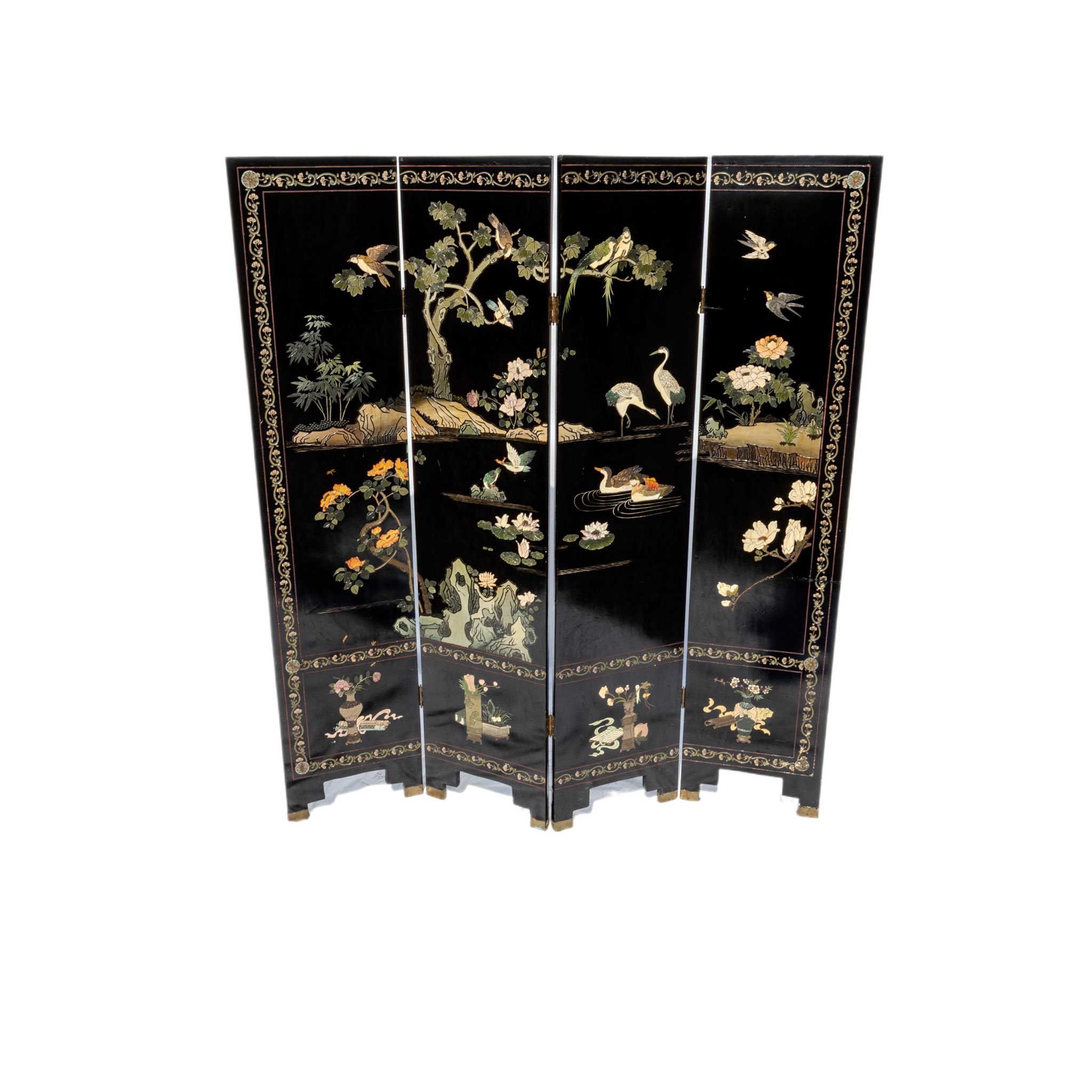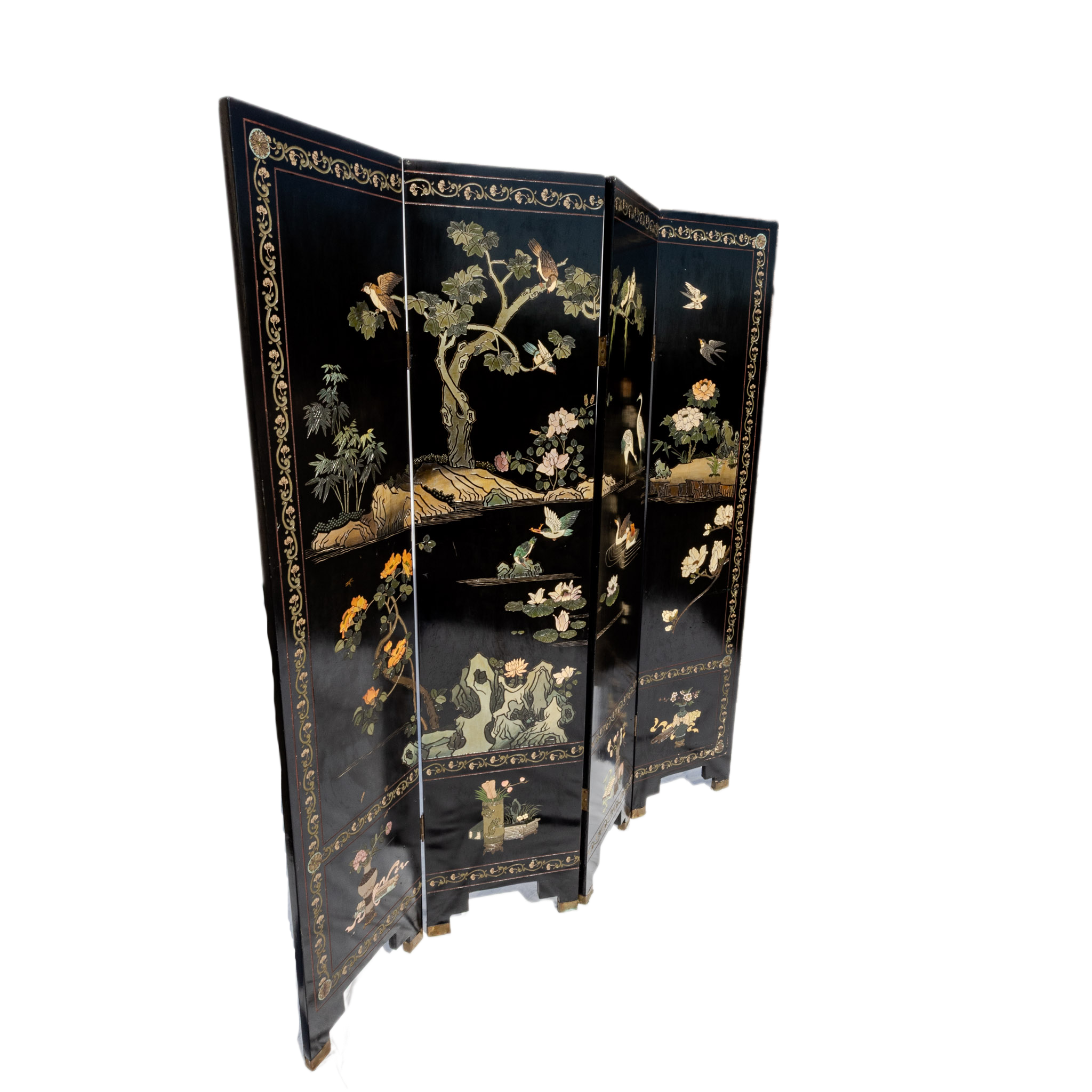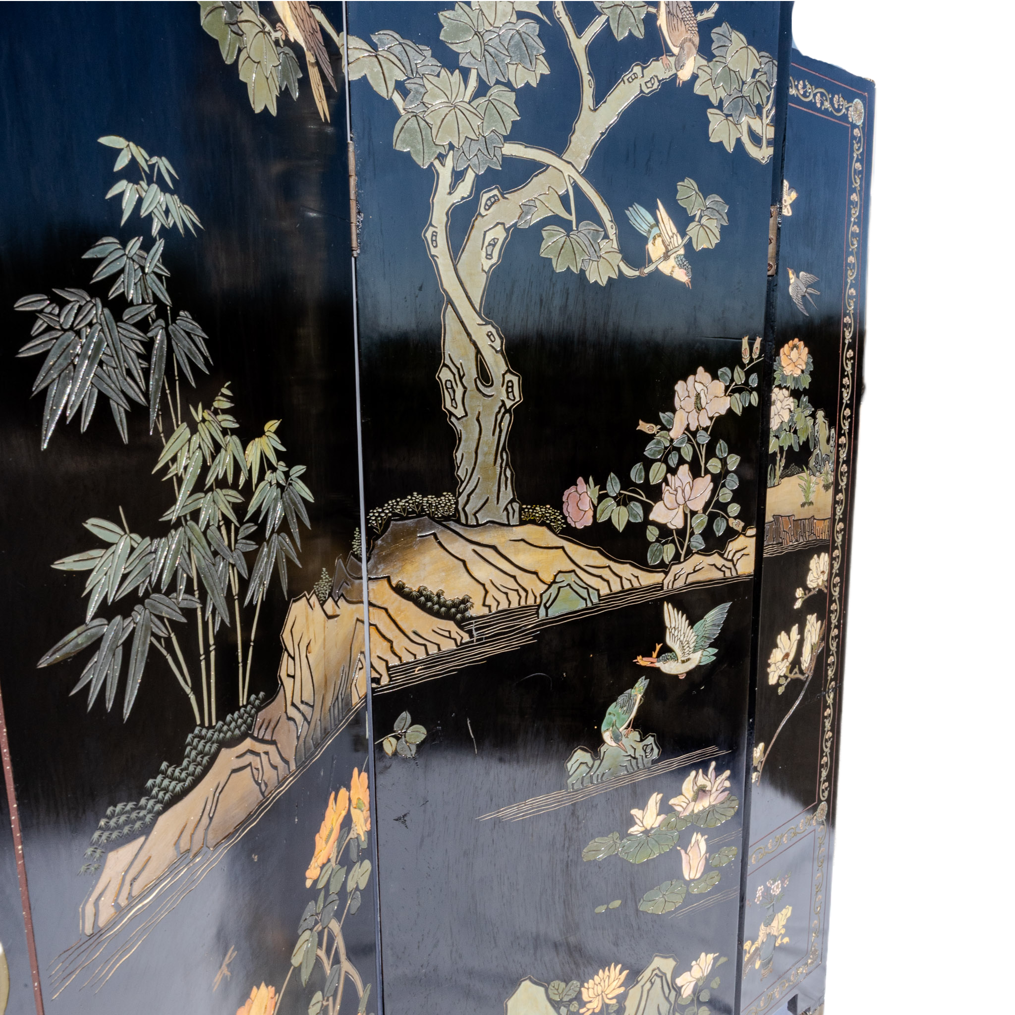 Paravento in legno laccato nero di olmo con decorazioni in altorilievo