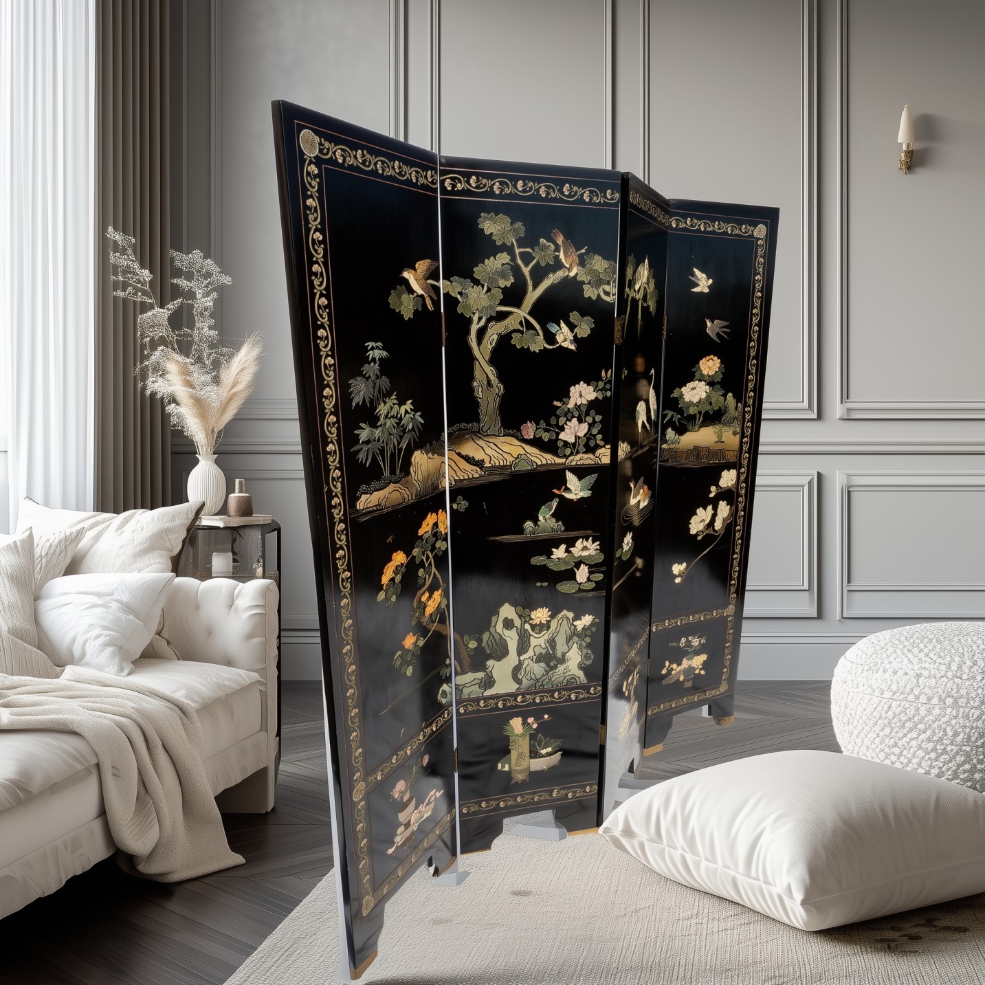 Paravento in legno laccato nero di olmo con decorazioni in altorilievo -17%
