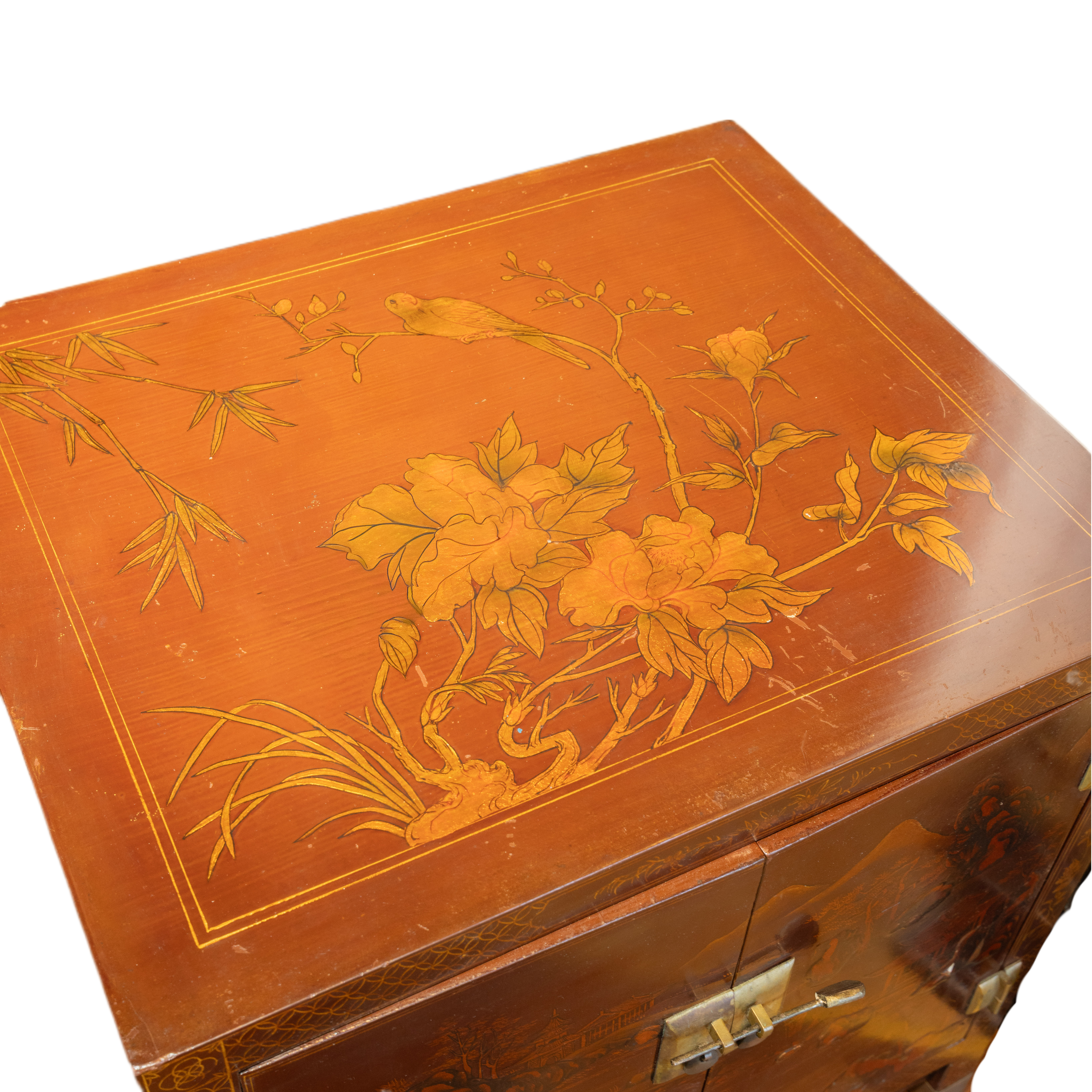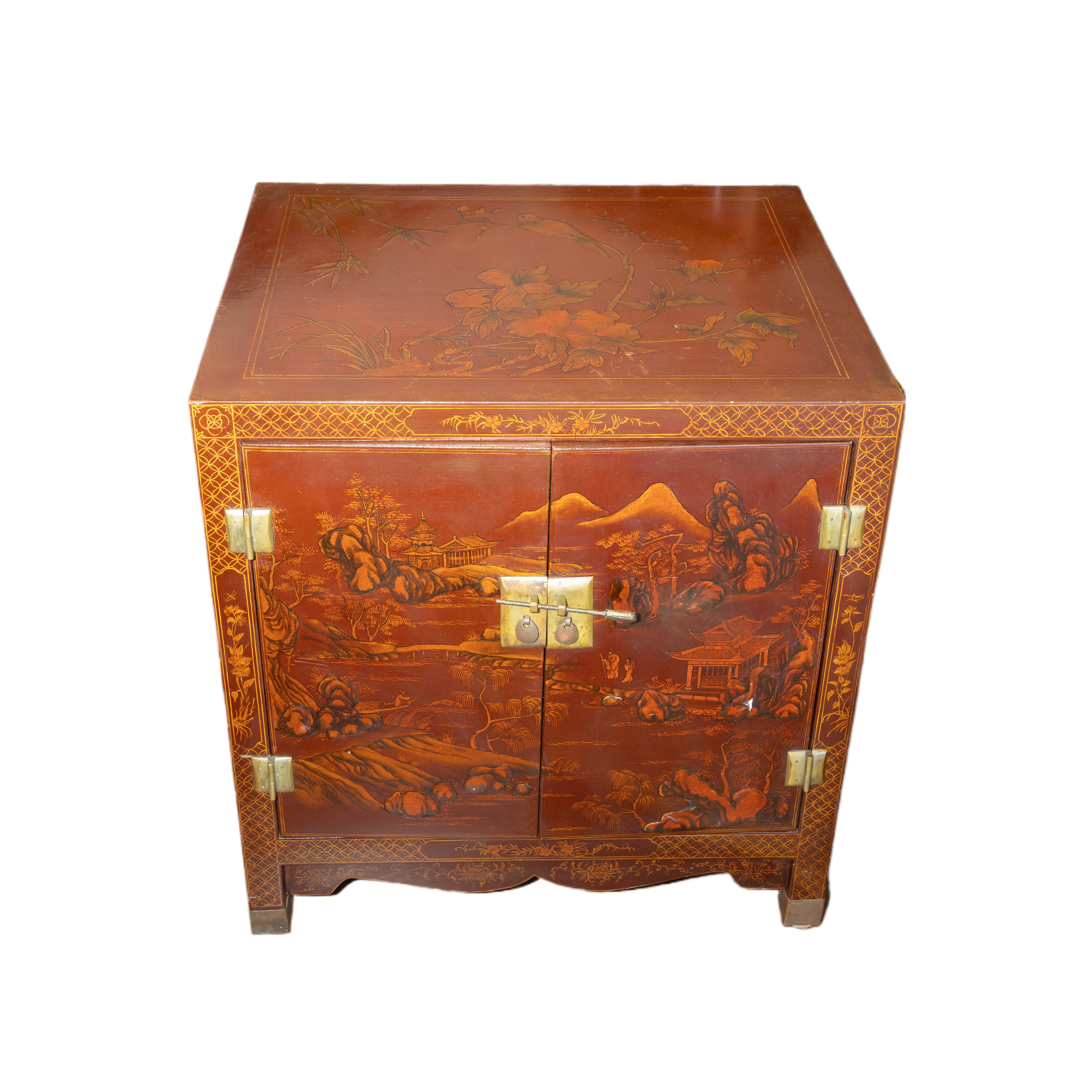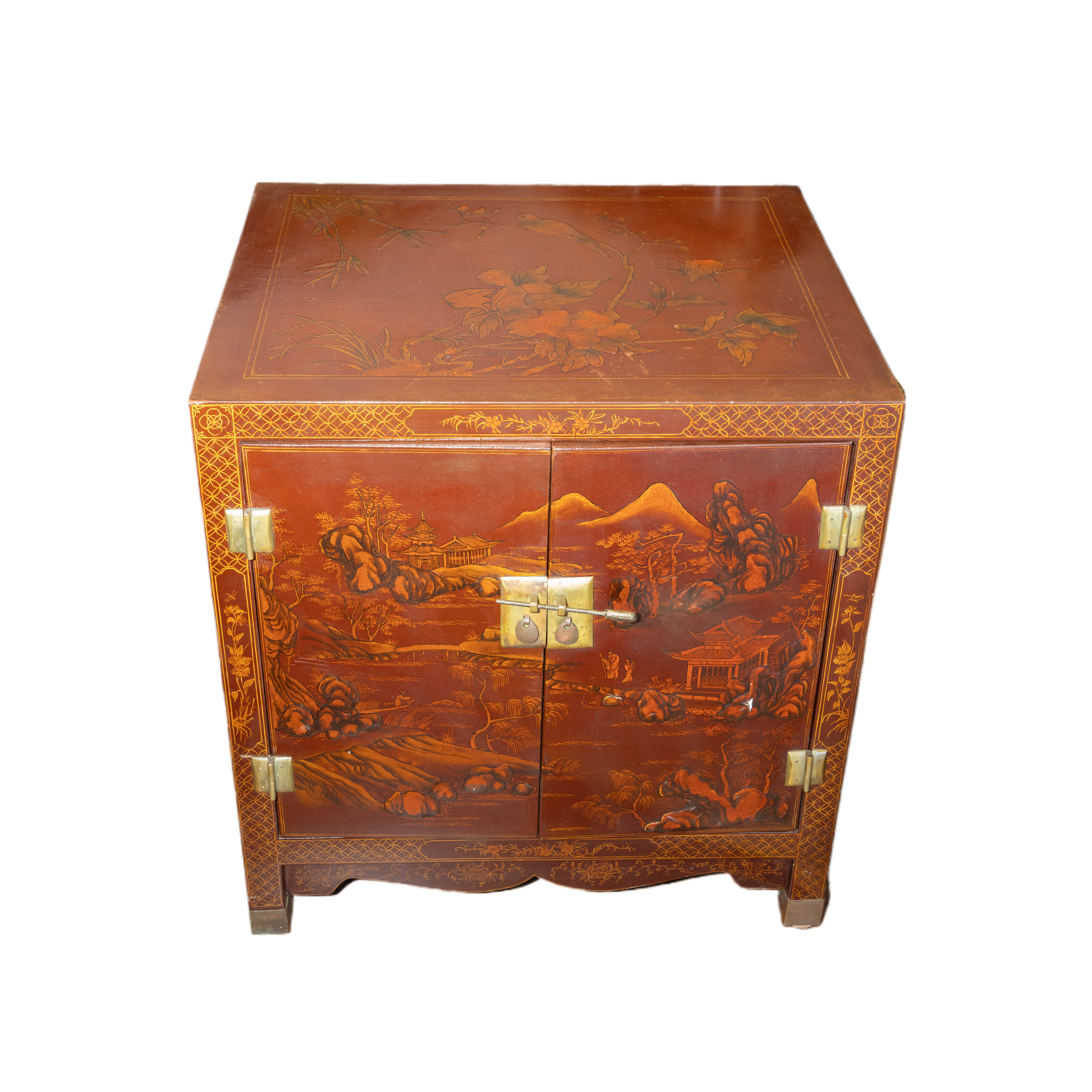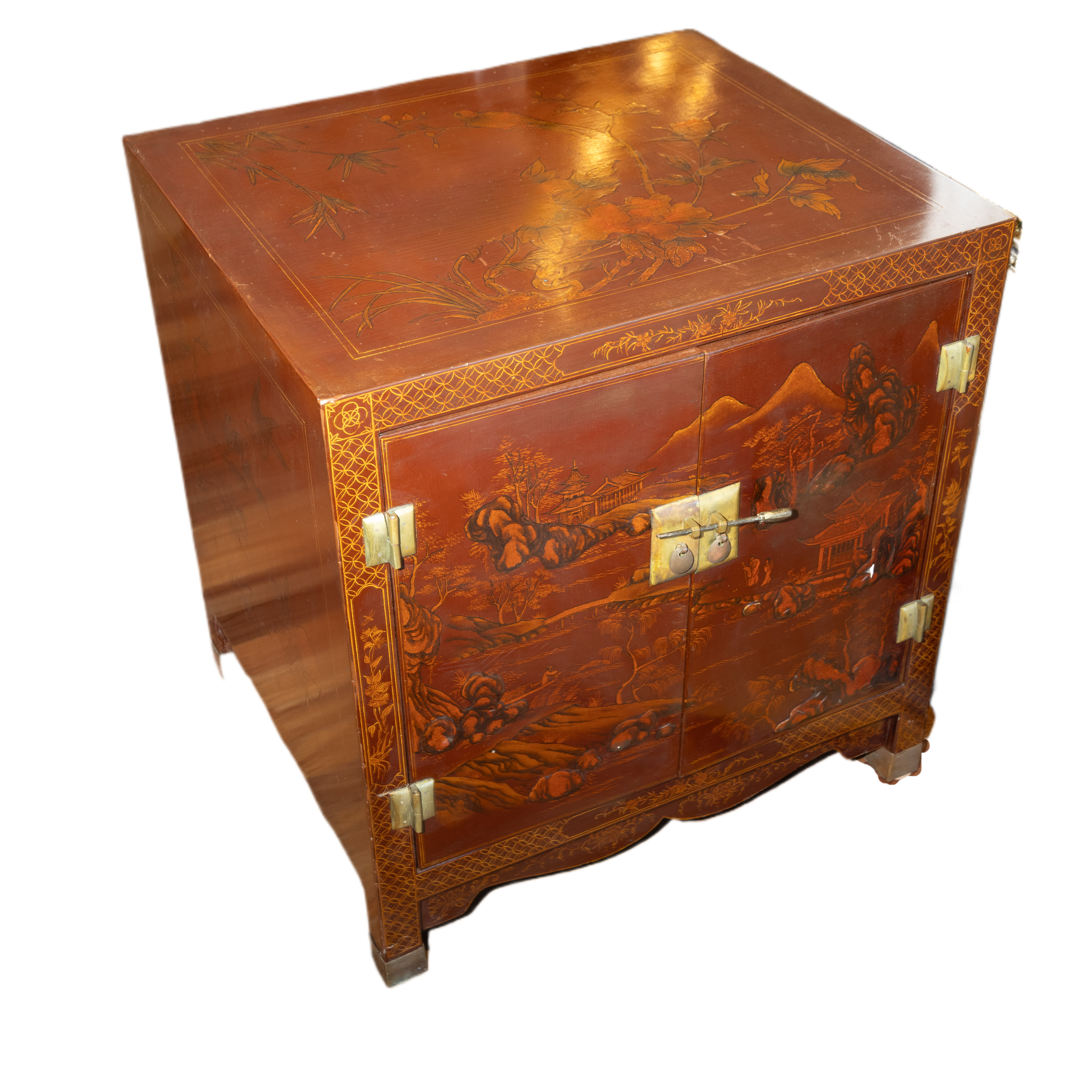 Mobiletto cinese in legno laccato bordeaux con decori color oro finemente dipinti a mano