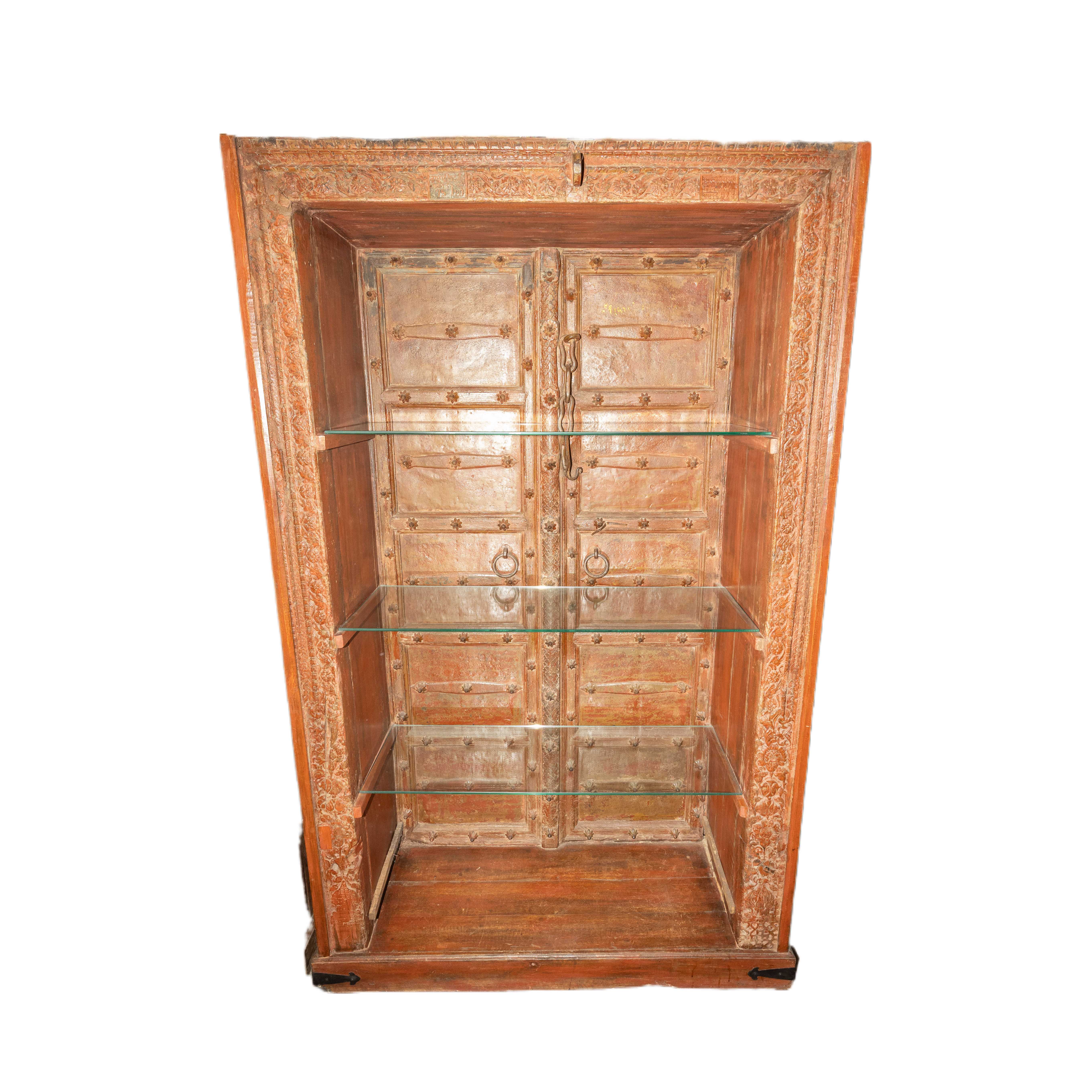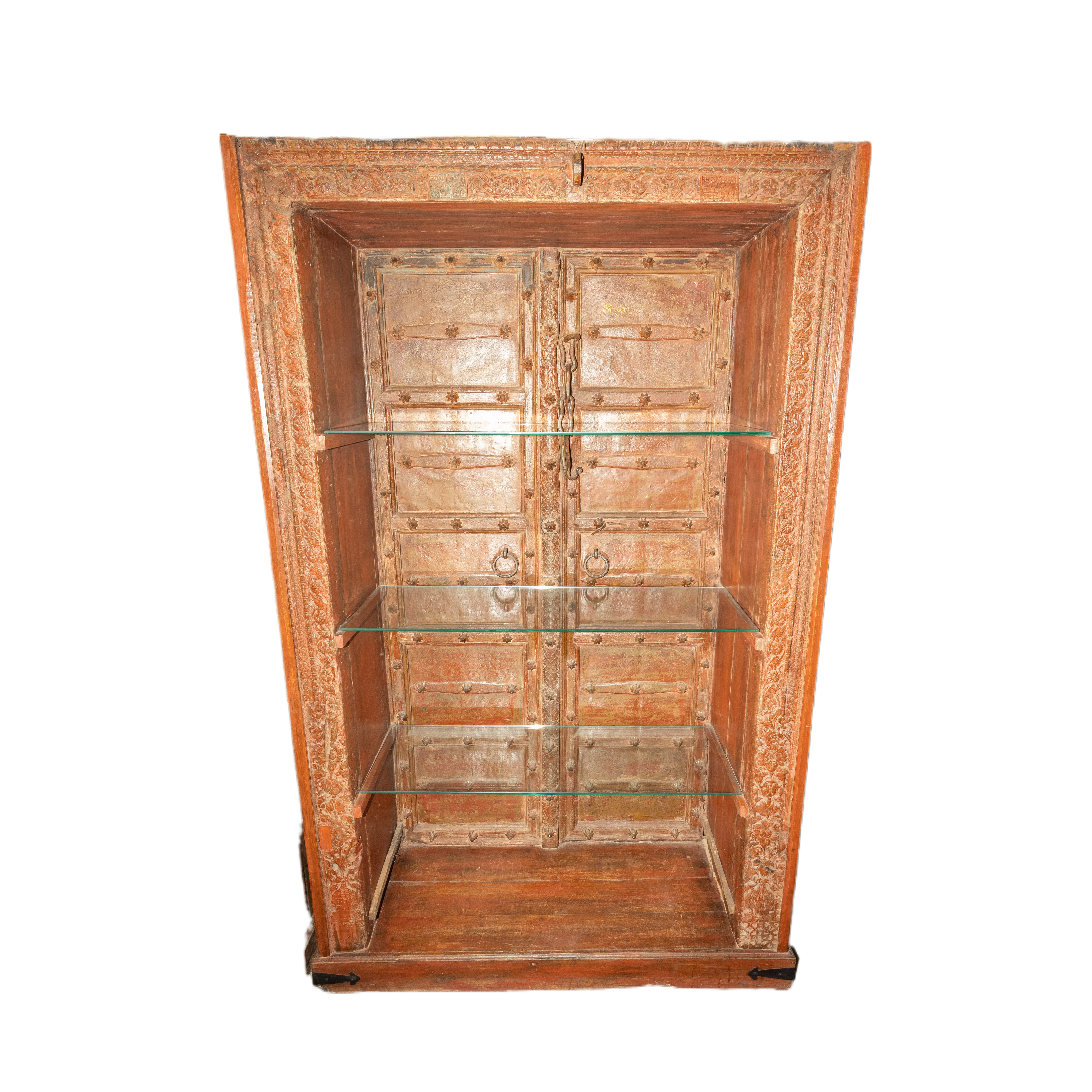 Libreria indiana con ripiani in vetro realizzata con recupero vecchio portale in legno di teak con cornice di vecchi palazzi #1433IN2490 -18%